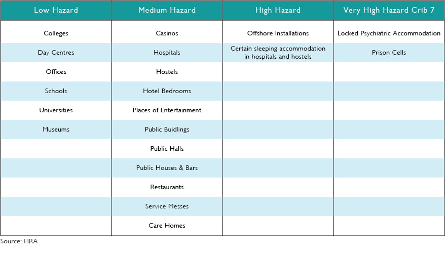 As a standard these are some of the classifications that are required by law to have all fabric and foam products meeting the Crib 5 classification as referenced by FIRA, they hold three hazard levels for Crib 5 treatment and one for Crib 7 and we would refer you to the BCFA/FIRA leaflet for a comprehensive guide to all legal requirements.