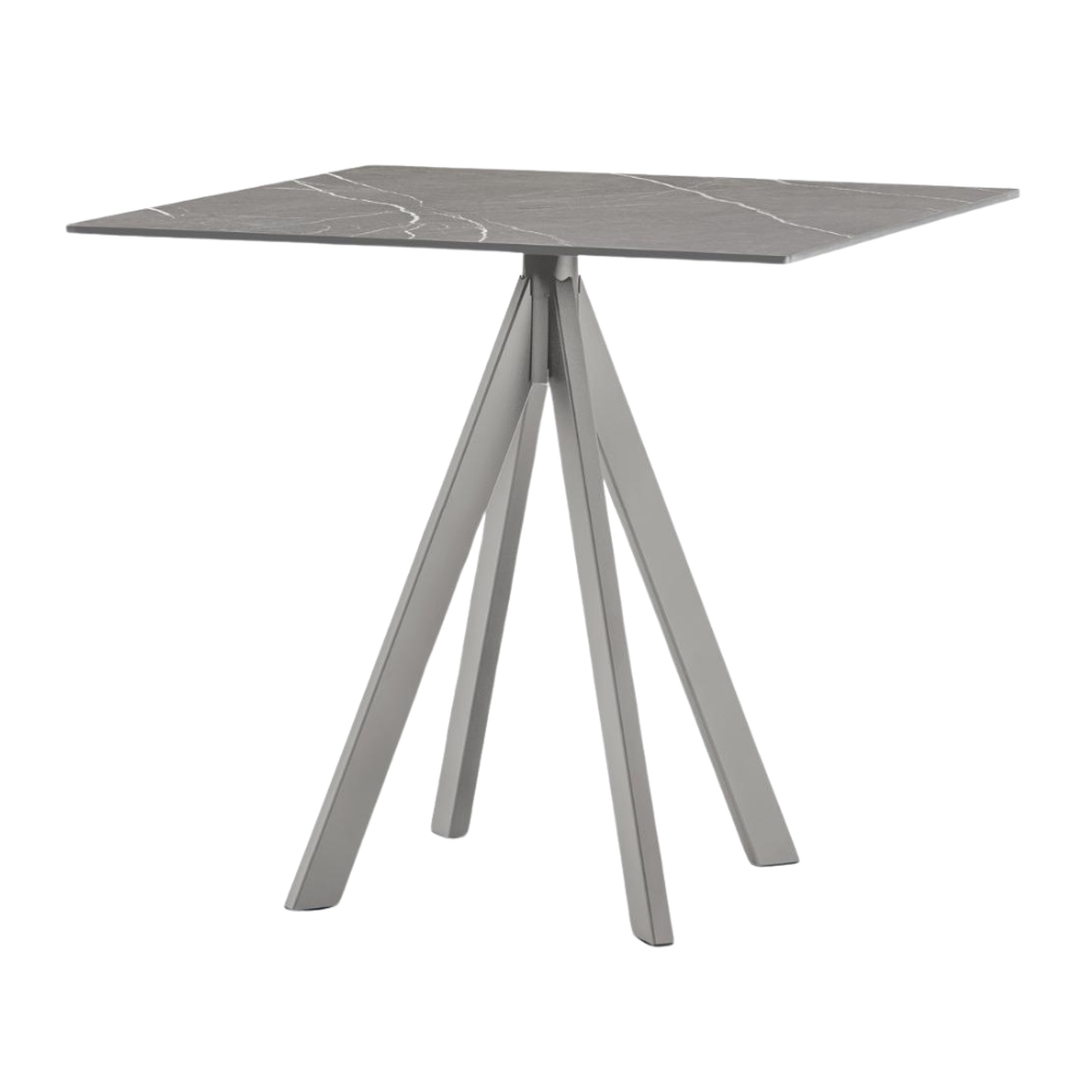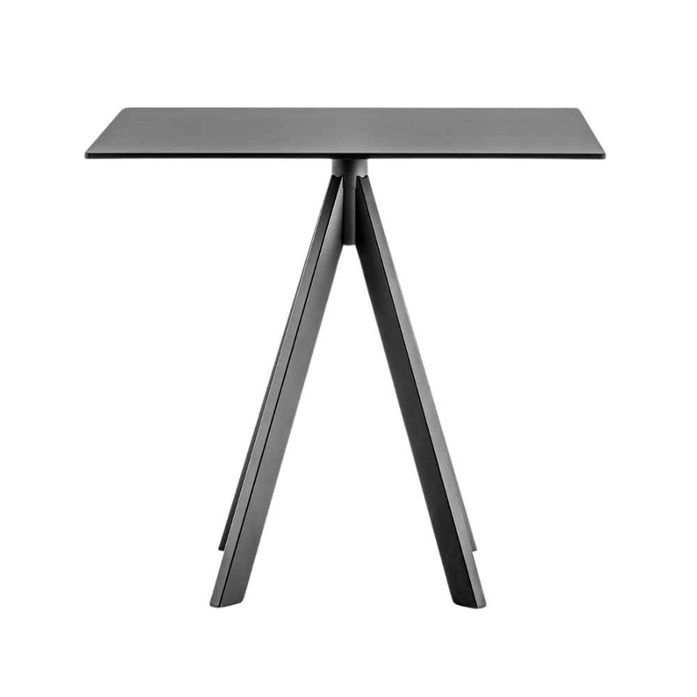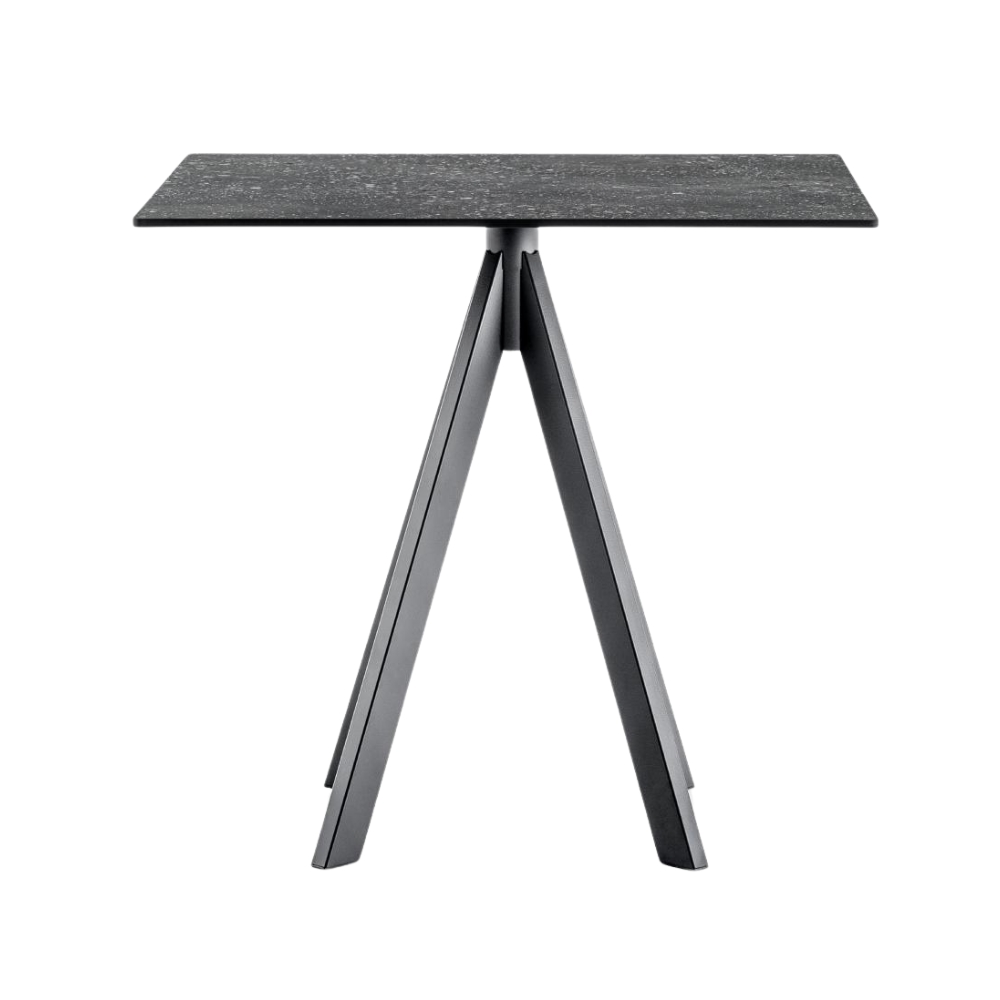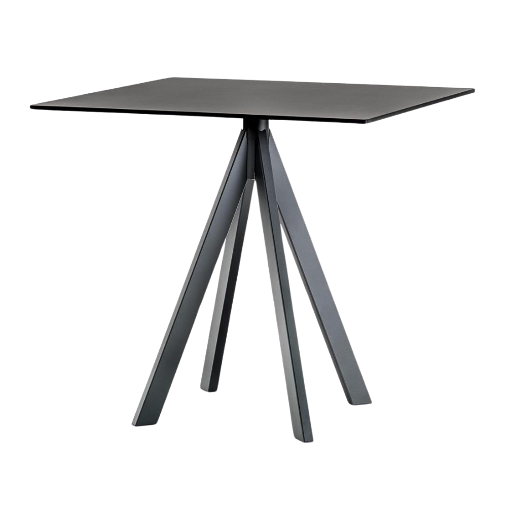 The Arki Table Base has a distinct industrial aesthetic. It features four rectangular-section steel tube legs that converge at the center of the tabletop.