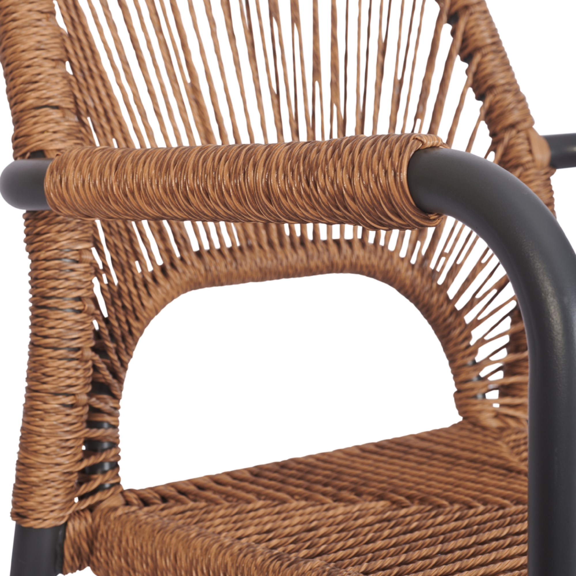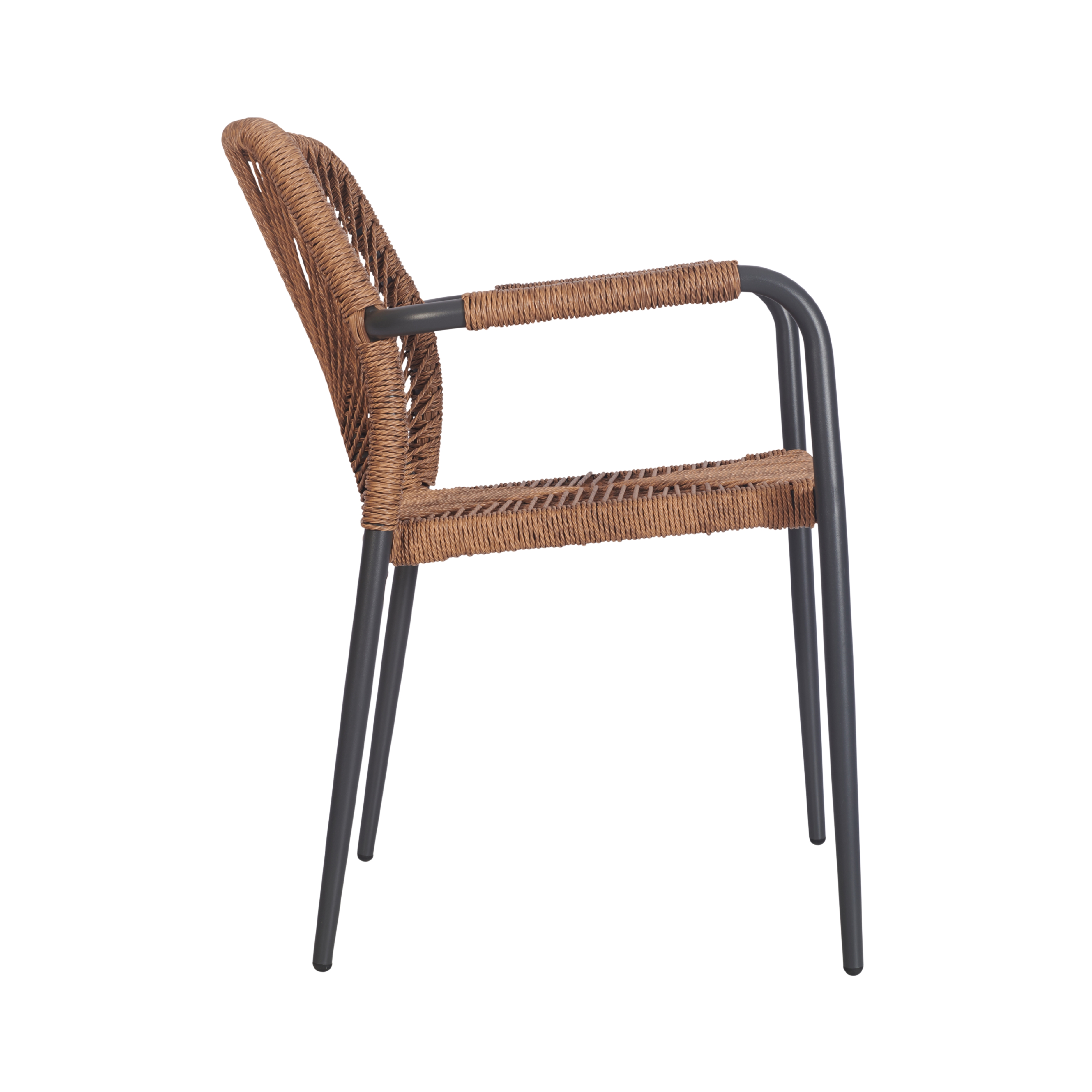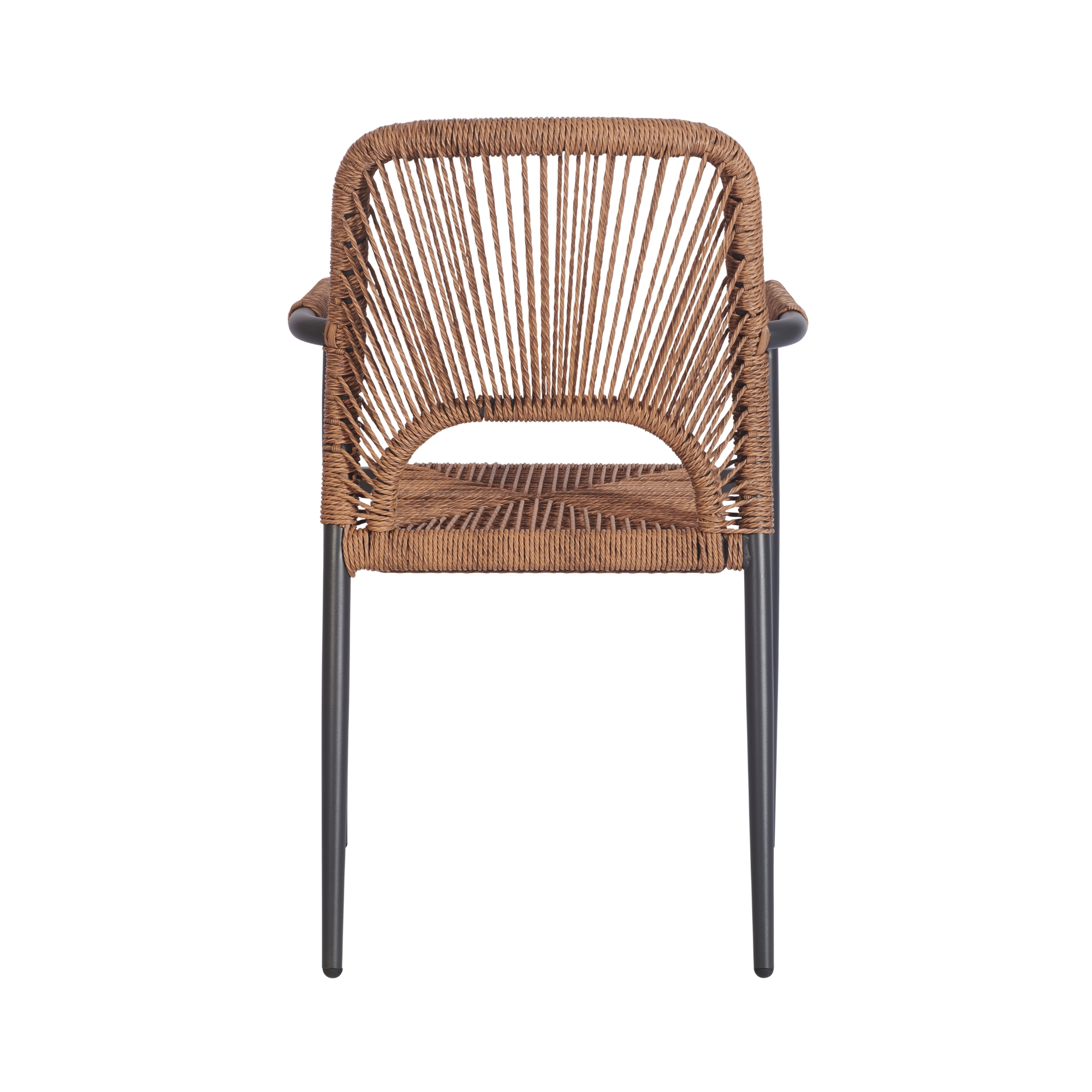 A sturdy powder-coated metal frame provides strength and stability, making it ideal for outdoor use in both residential and hospitality settings. The gently curved armrests add ergonomic support, ensuring relaxed seating for long lunches or evening gatherings.