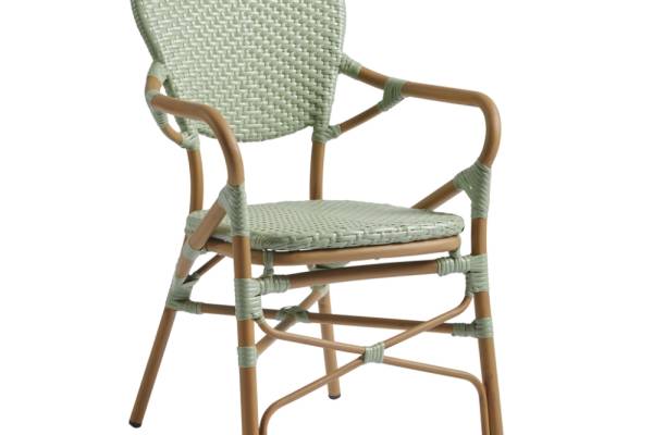 The Brittany Arm Chair boasts a high-quality faux wicker seat and backrest, complemented by a durable aluminium frame with a bamboo effect.