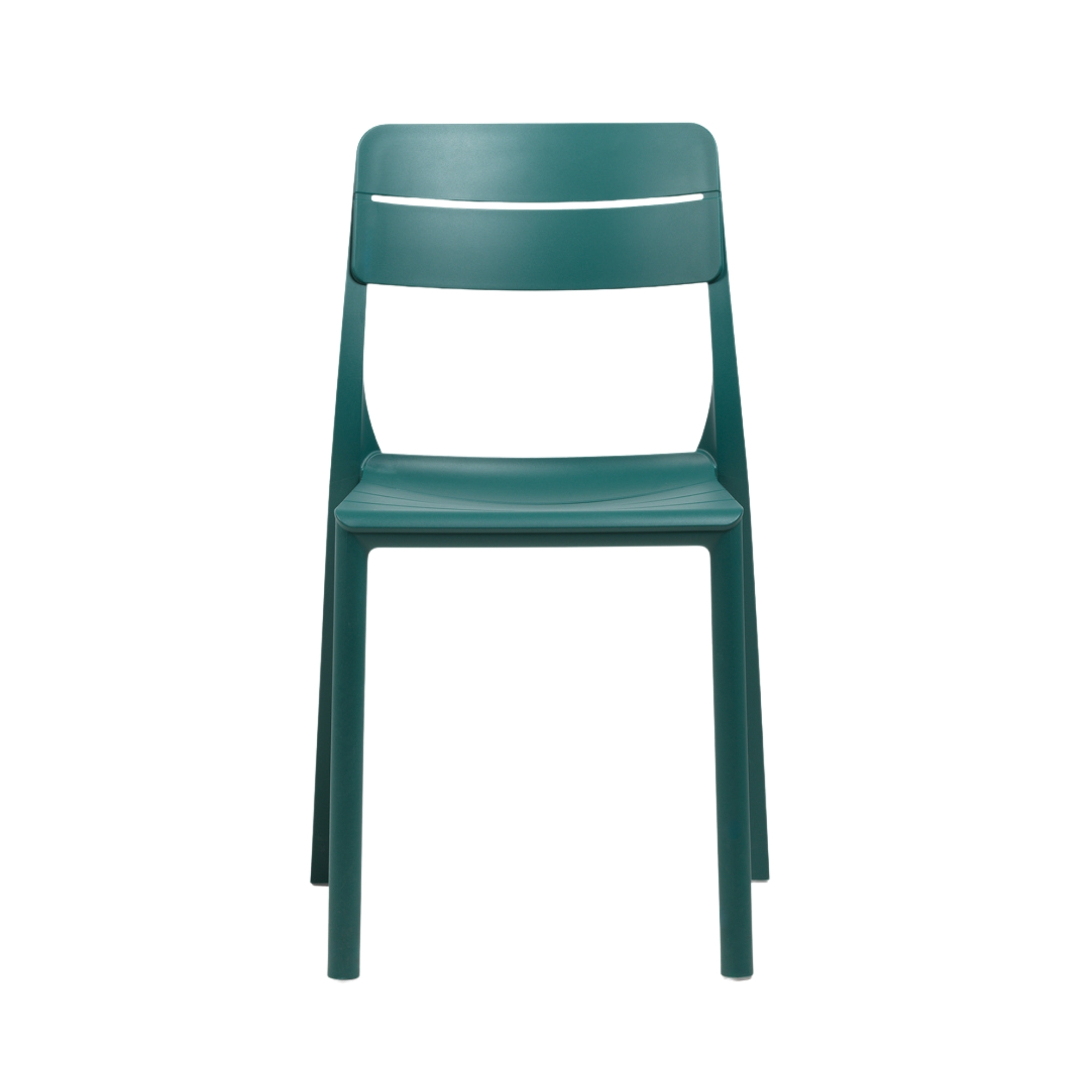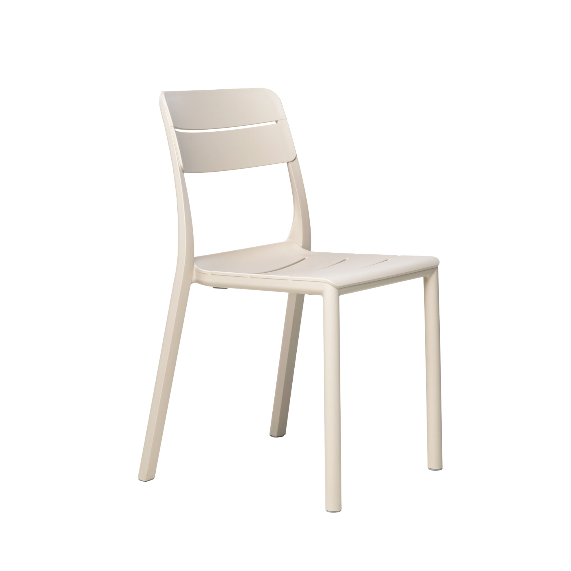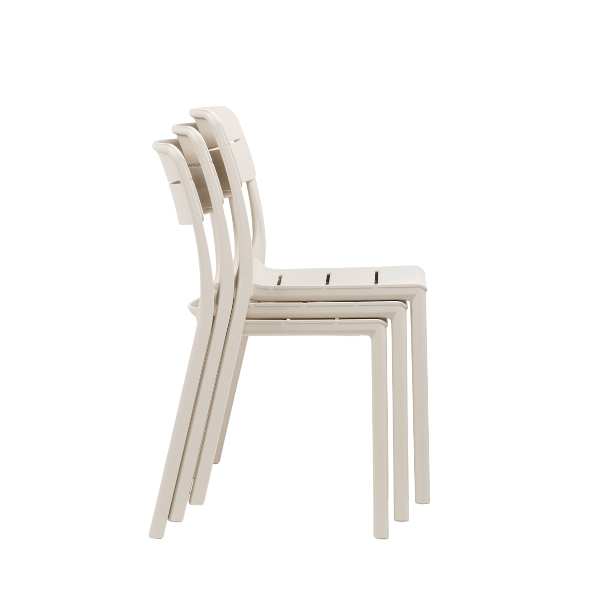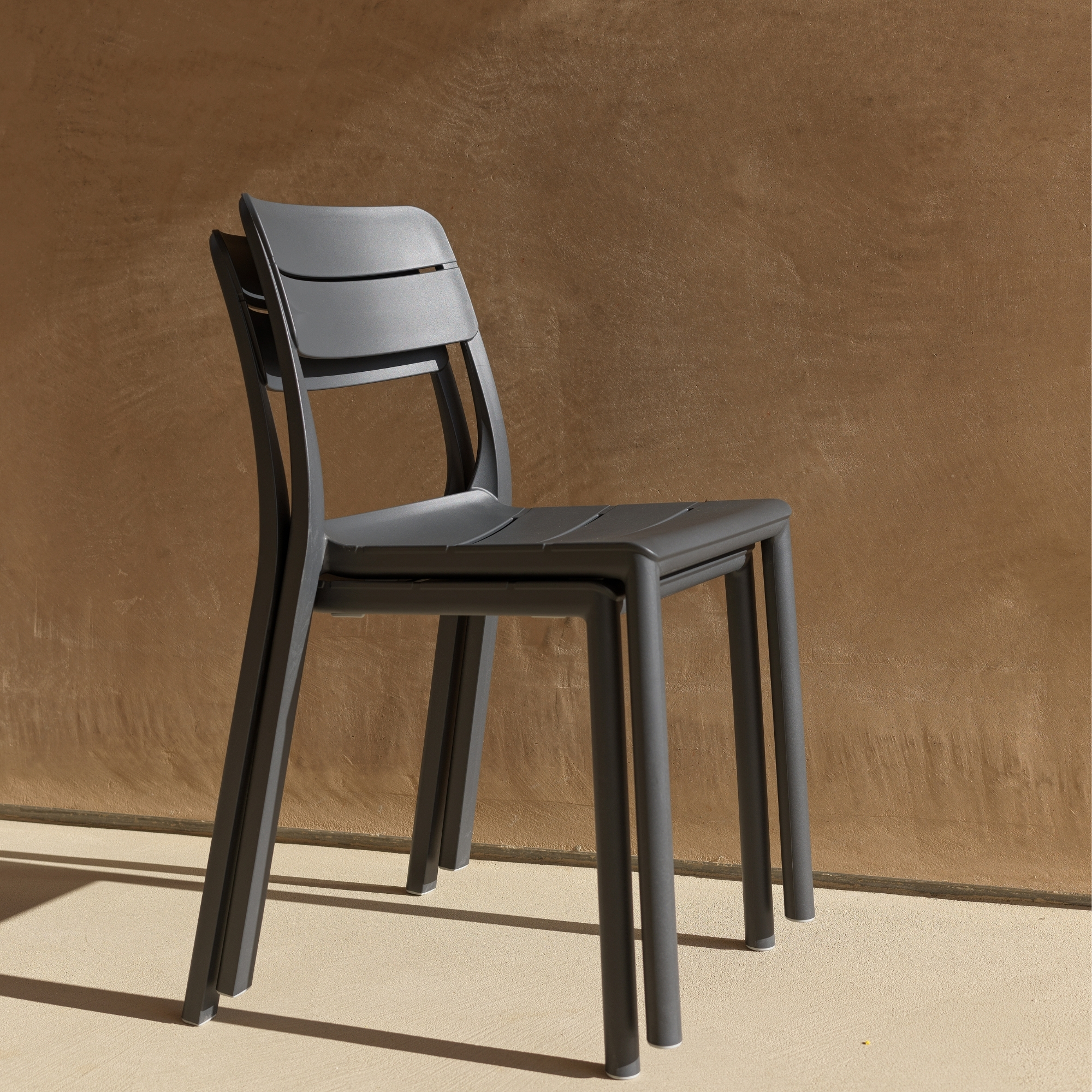 The Cassia chair features stylised horizontal slats and a compact, armless design, offering comfort and versatility while maximizing small spaces. Perfect for modern indoor or outdoor settings.