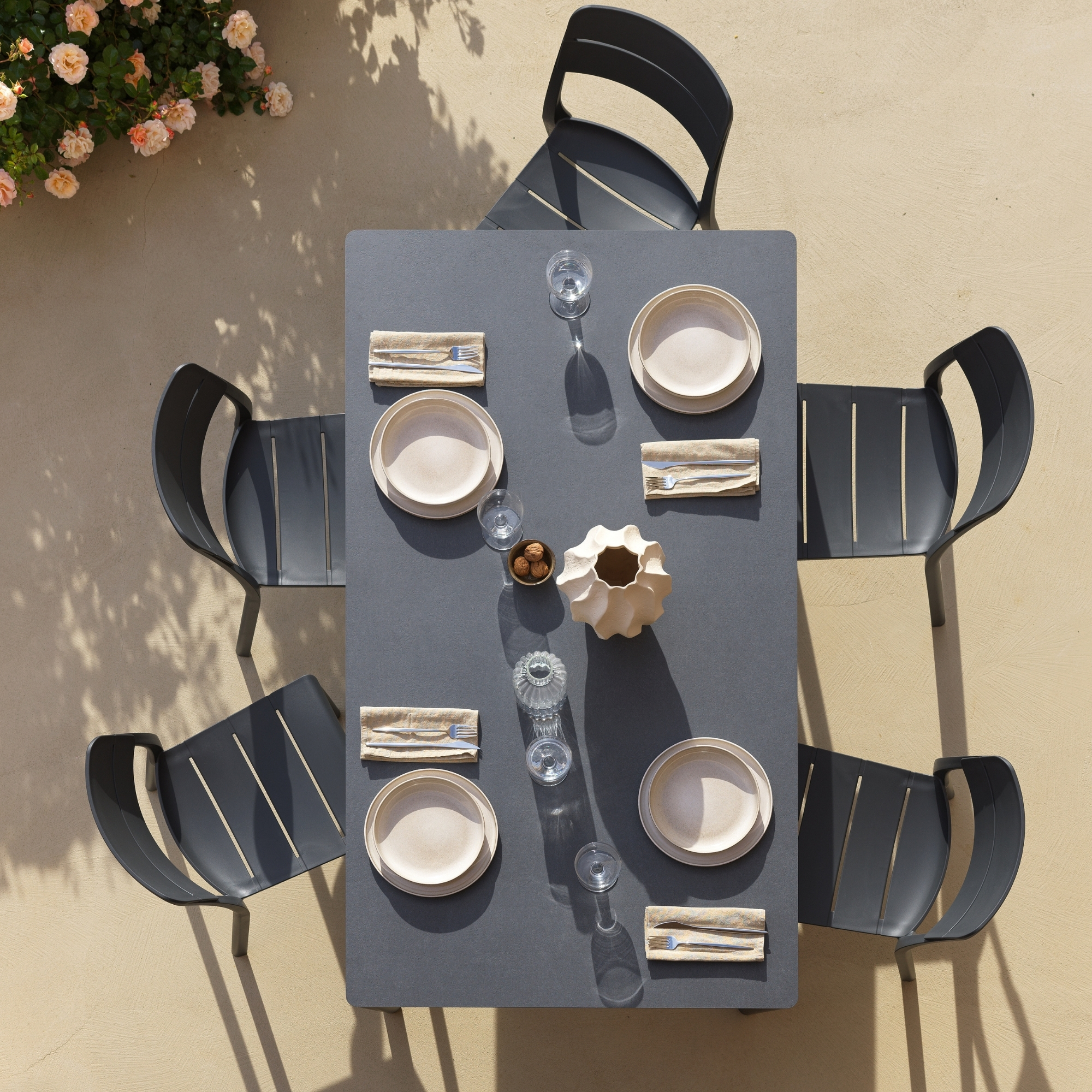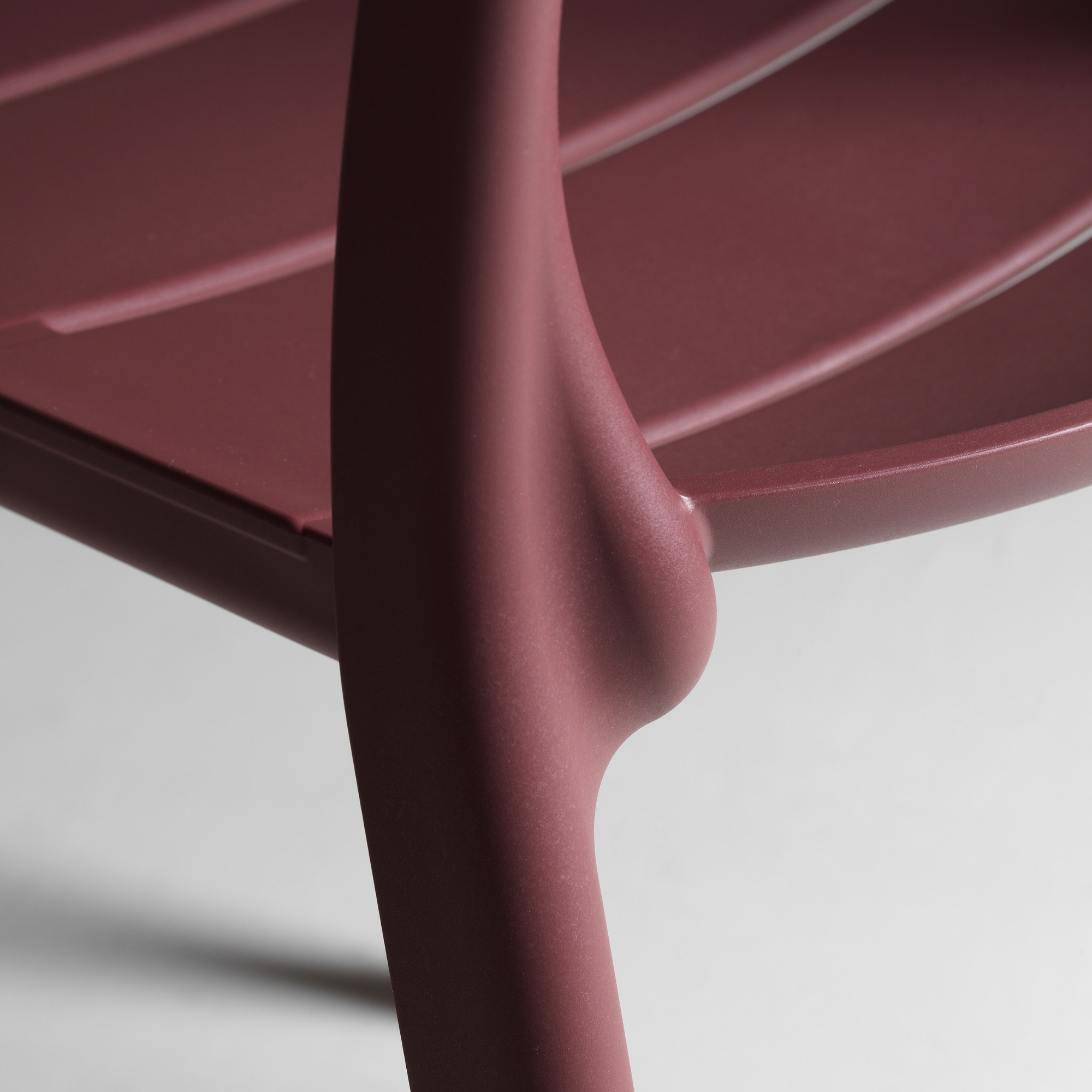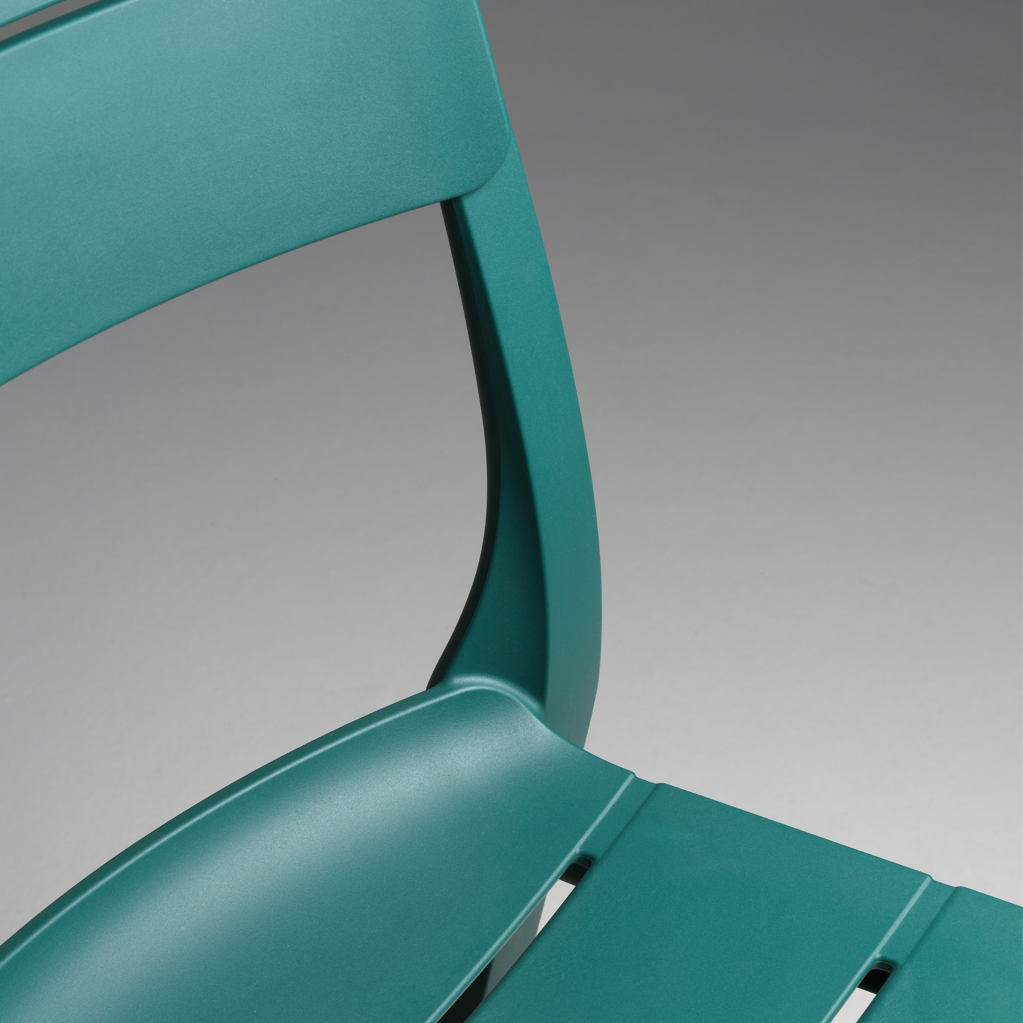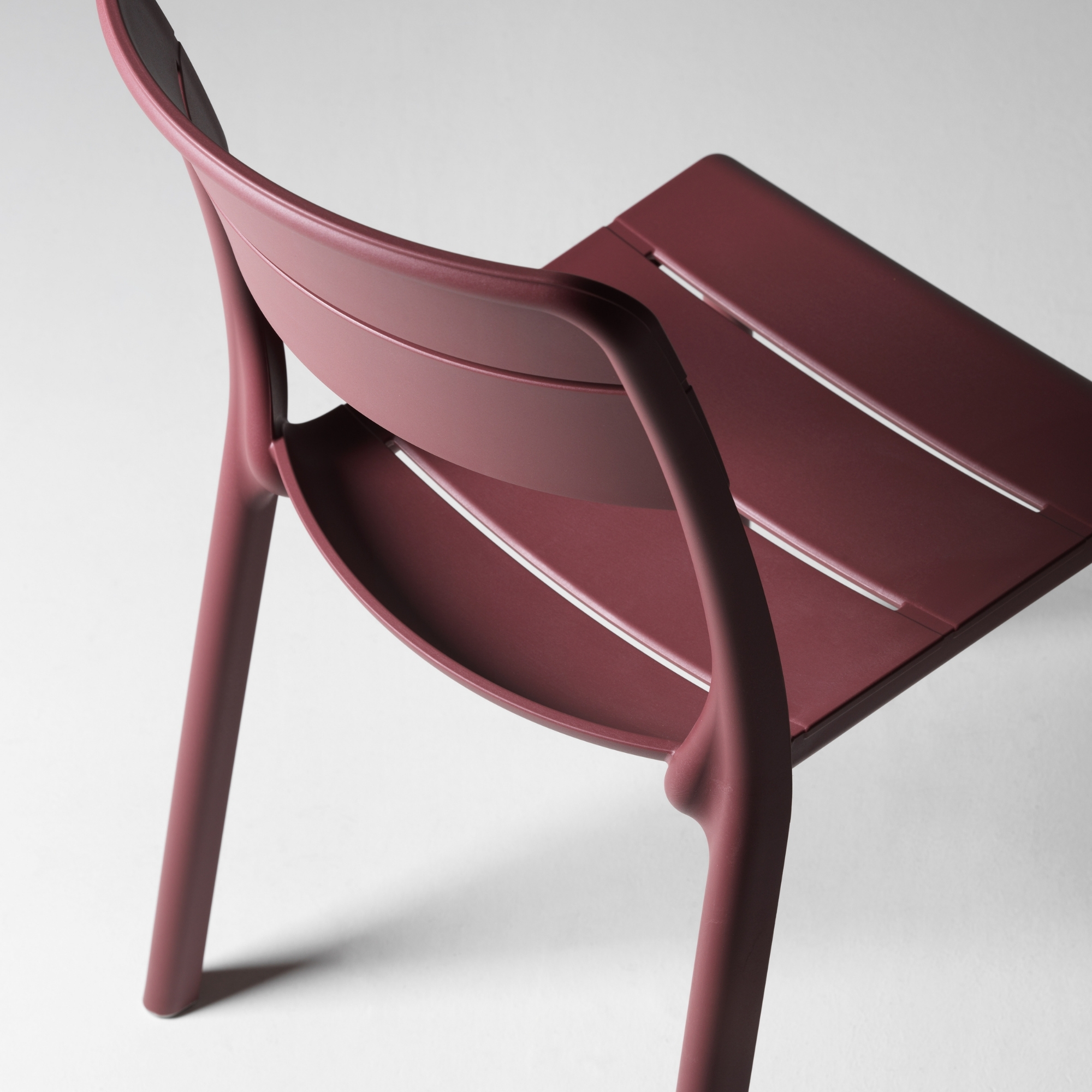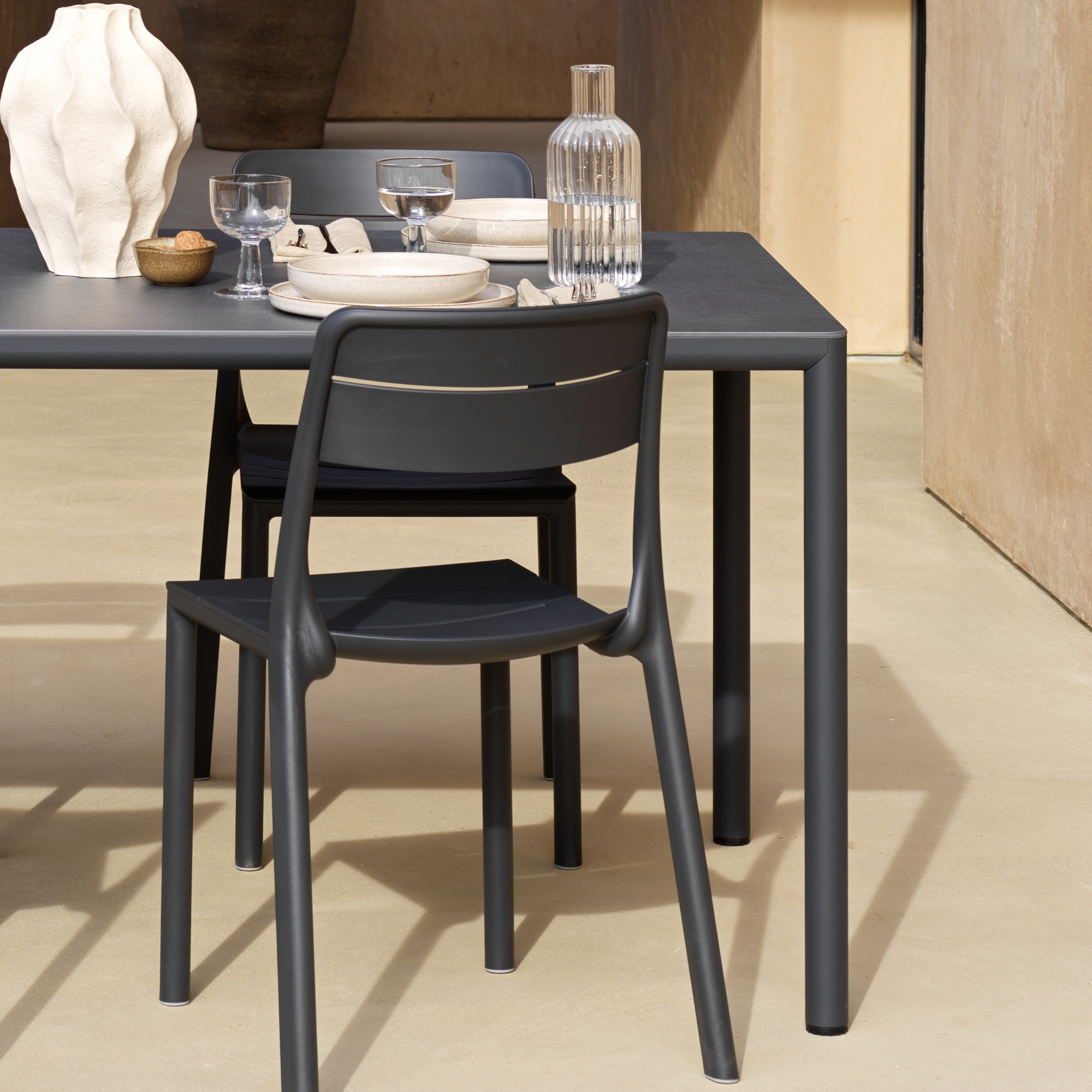 The Cassia chair features stylised horizontal slats and a compact, armless design, offering comfort and versatility while maximizing small spaces. Perfect for modern indoor or outdoor settings.
