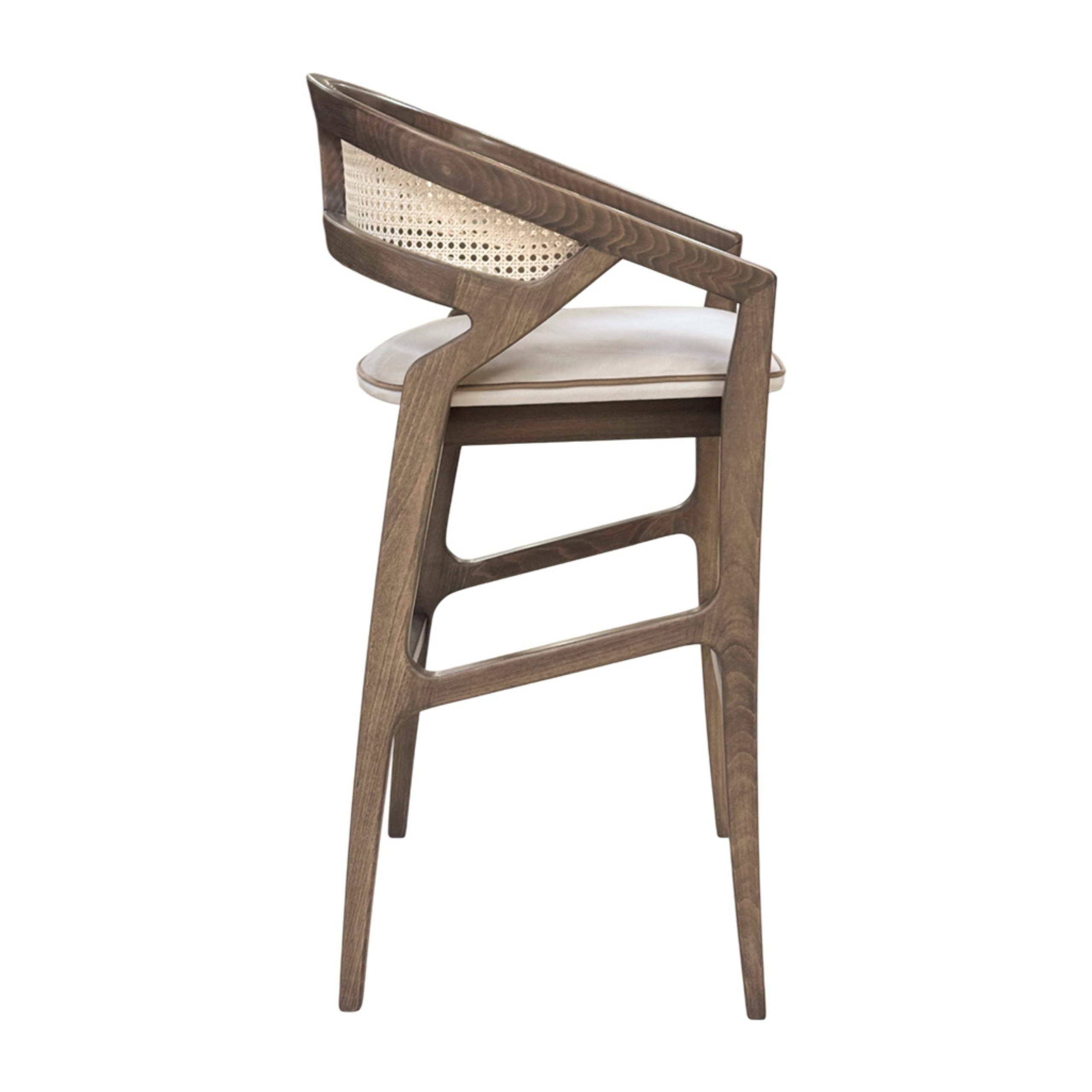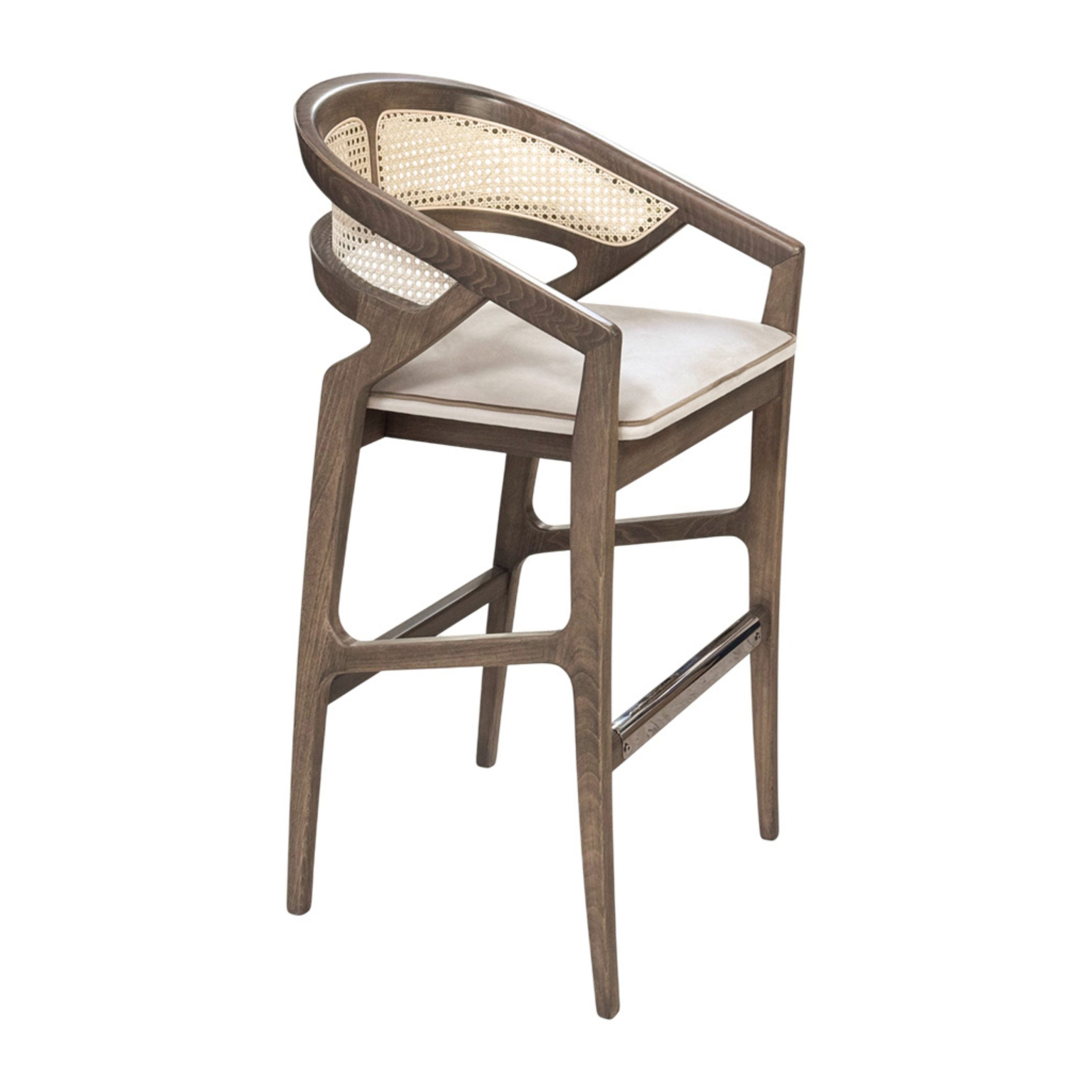 Model Number : 78295This striking bar stool features a gracefully curved wooden frame complemented by a woven cane backrest that adds texture and lightness. The generously padded seat, offering both comfort and style.