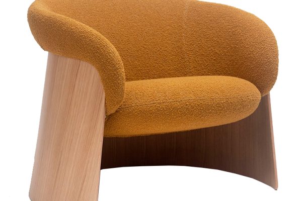 Meet the Ginger Wood Lounge Chair. Featuring soft, rounded shapes, this piece offers distinct base options: a four-leg structure, a decorative and organic sled frame, and a wooden collar base.