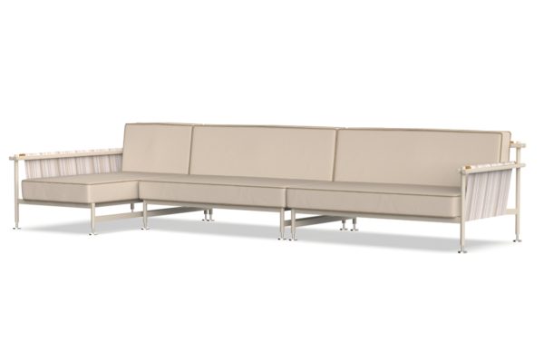This elegant sofa features a sturdy aluminum frame, teak accents, and polished aluminum legs. Its outdoor-specific upholstery combines durability with the comfort of indoor fabric. Available in a diverse colour palette, it seamlessly adapts to both outdoor and indoor environments.