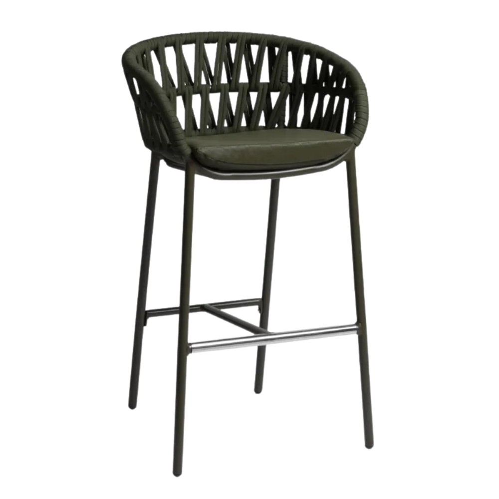 Model Number : 77833The Manila Barstool features a polyester powder-coated aluminium frame with a backrest elegantly wrapped in hand-woven synthetic rope. Its cushion includes a removable PVC fabric cover and quick-dry padding for added comfort and practicality.