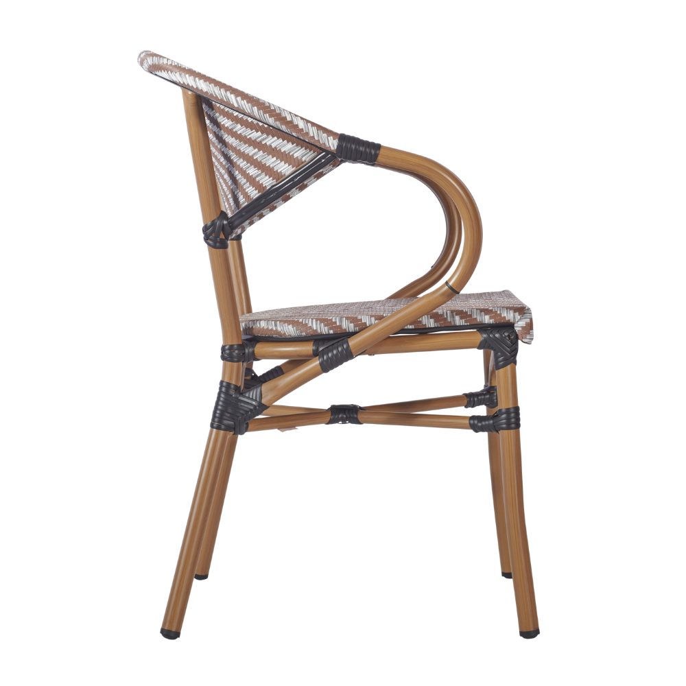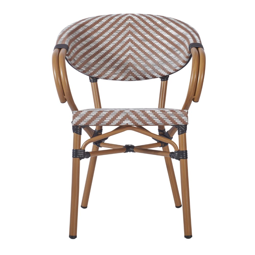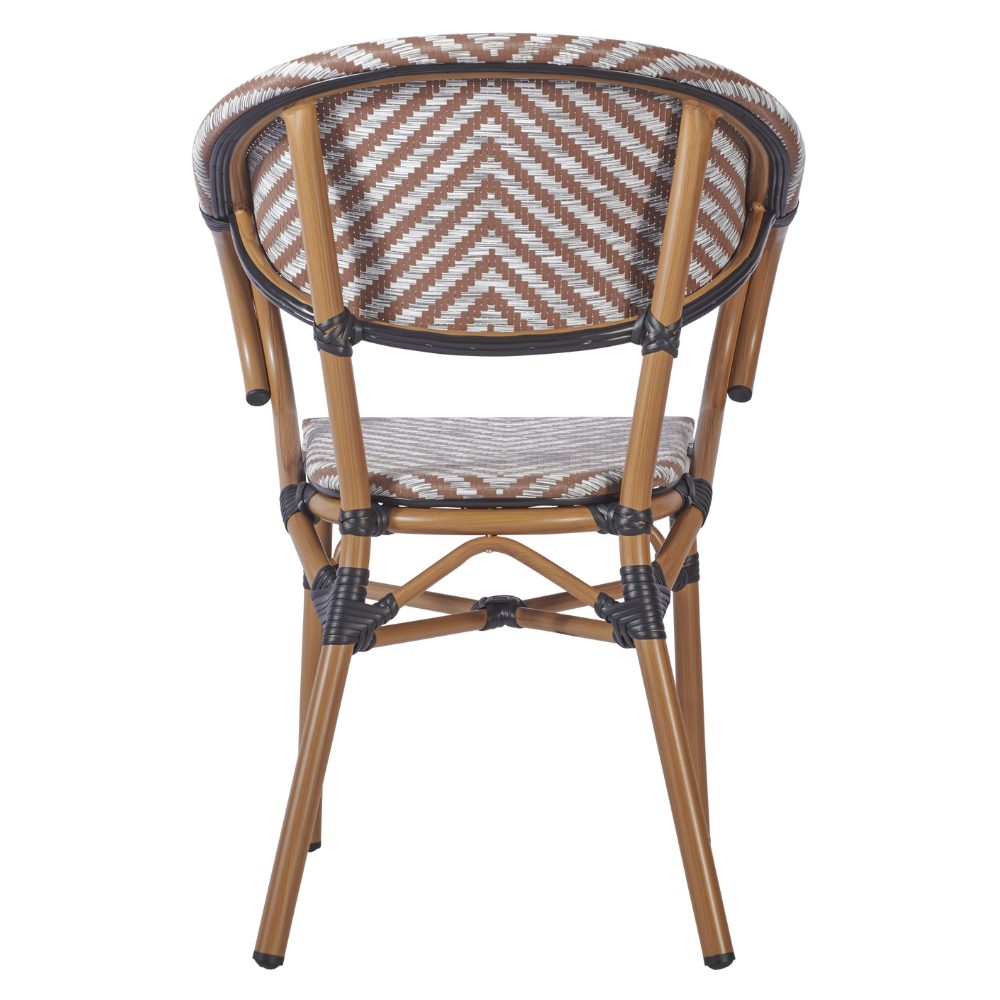 The Montpellier Armchair is a modern, bistro-inspired chair featuring a chevron weave and an aluminium bamboo effect. Its versatile design makes it a perfect fit for a variety of outdoor settings.