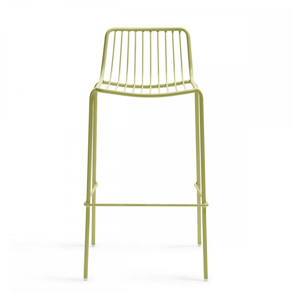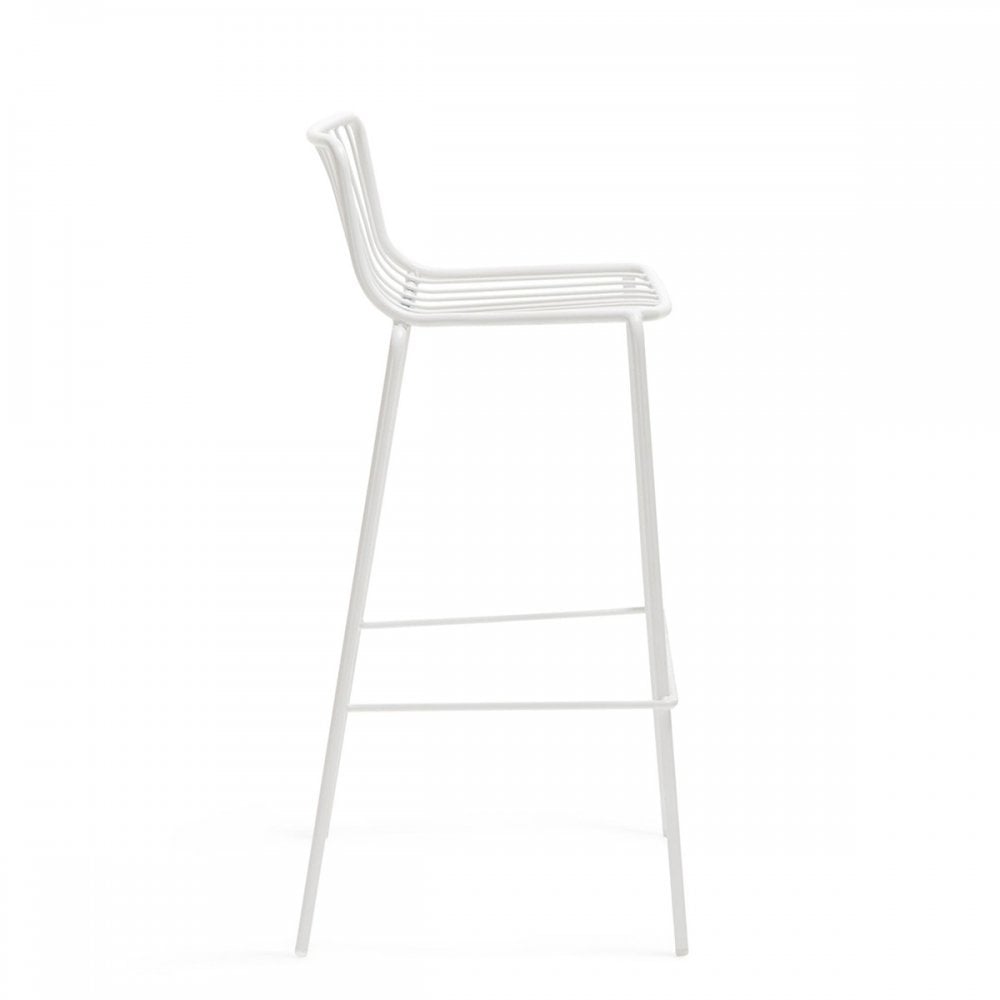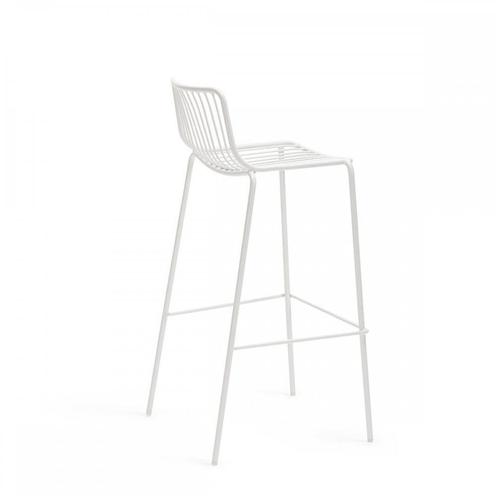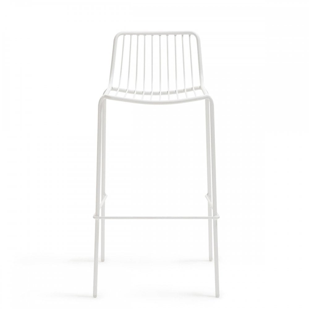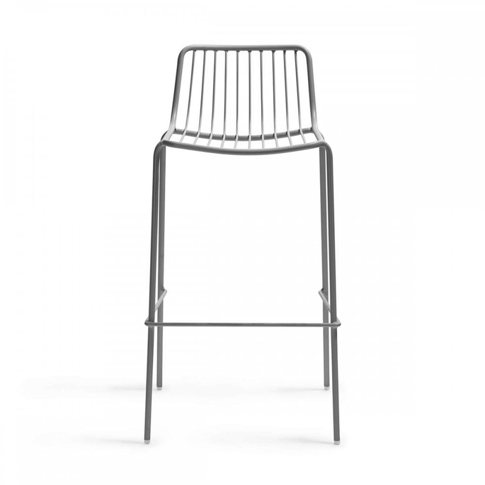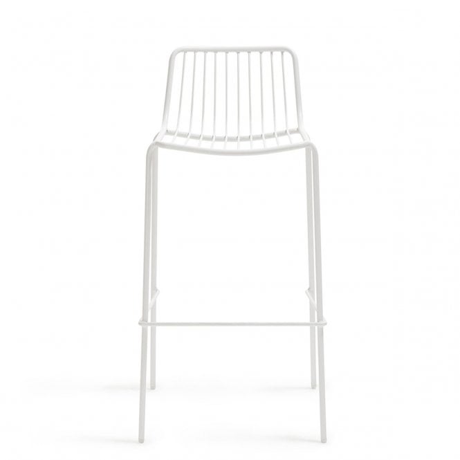 The Nolita Bar Stool is a minimalist armchair with a sleek, open-frame design. Made from powder-coated metal, the chair features thin vertical slats for the seat and backrest, complemented by curved armrests for added comfort.