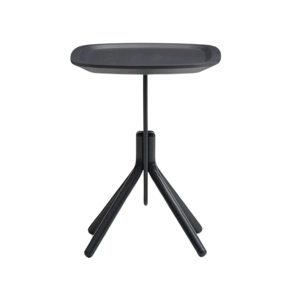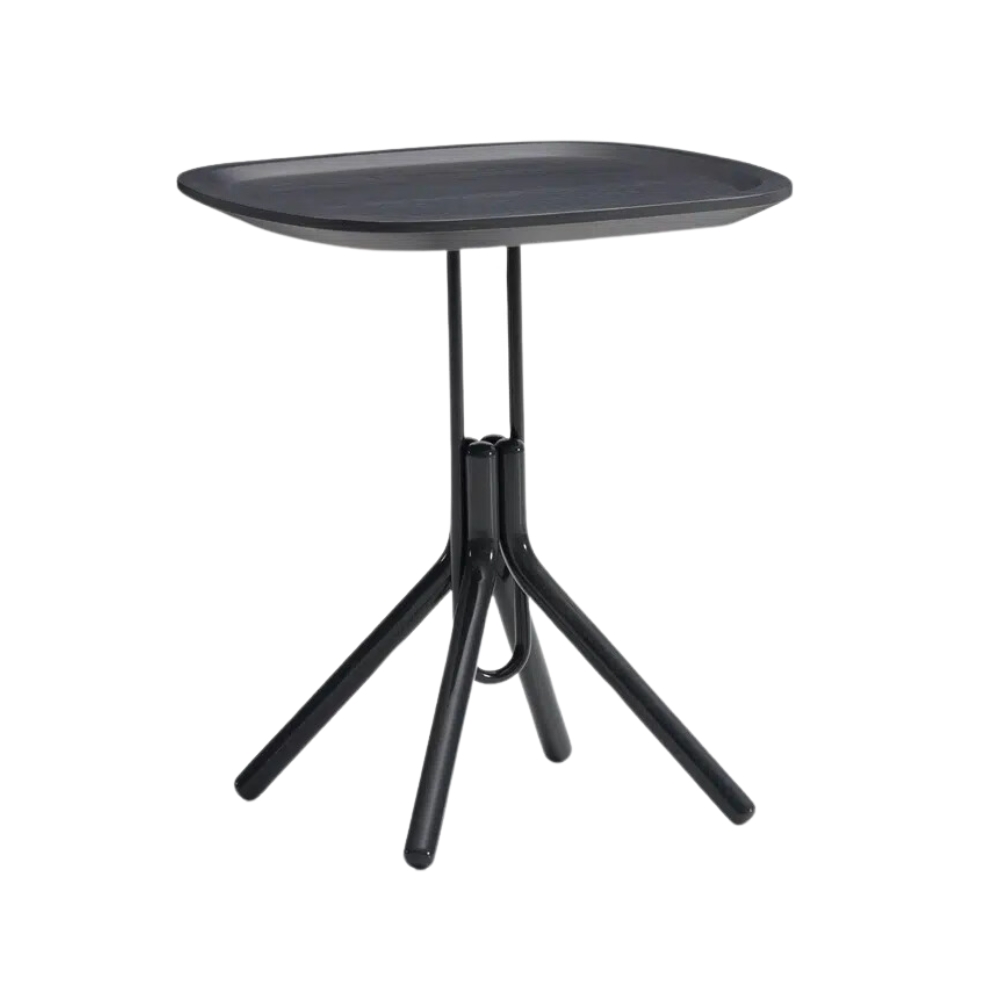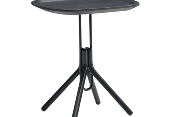 This piece is a refined study in form, drawing inspiration from Art Deco and reimagining it through a contemporary lens influenced by Scandinavian design principles. A wooden tray appears to balance gracefully on a slim metal rod that curves at the base.
