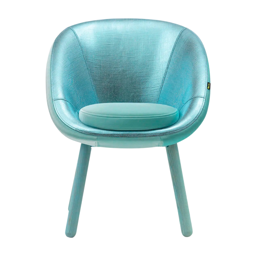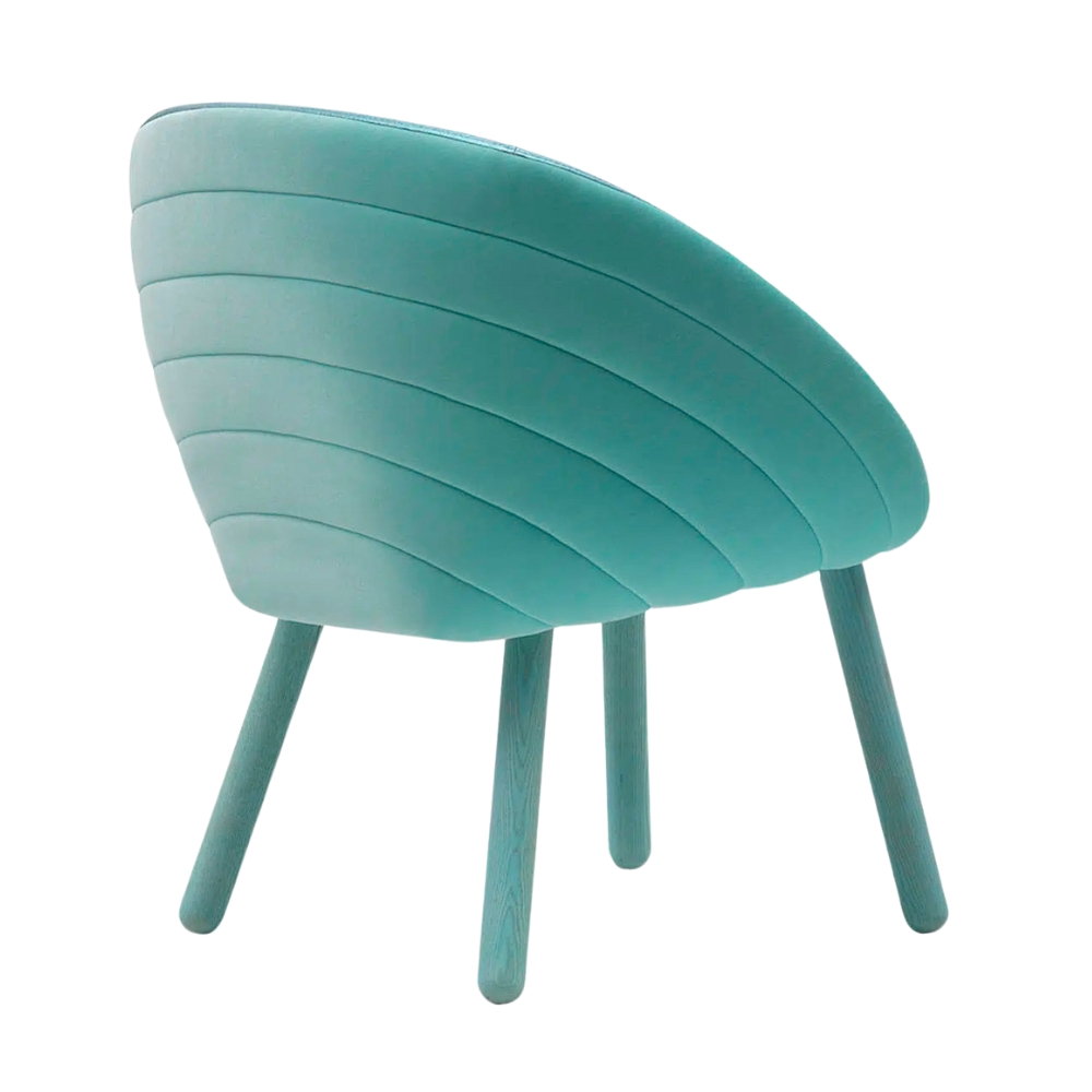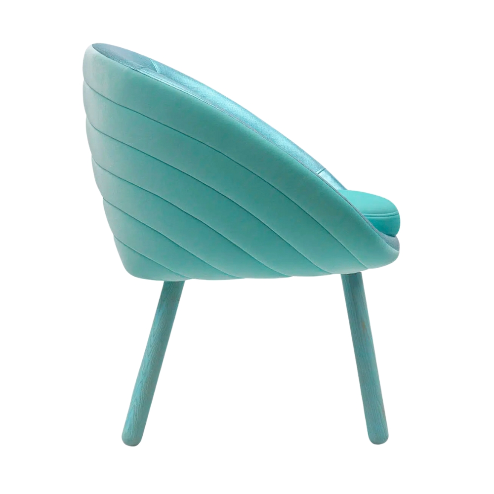 The vibrant upholstery colour of this armchair, paired with its gently curved design, creates a sense of visual lightness that elevates and highlights the furniture’s smooth, organic form.