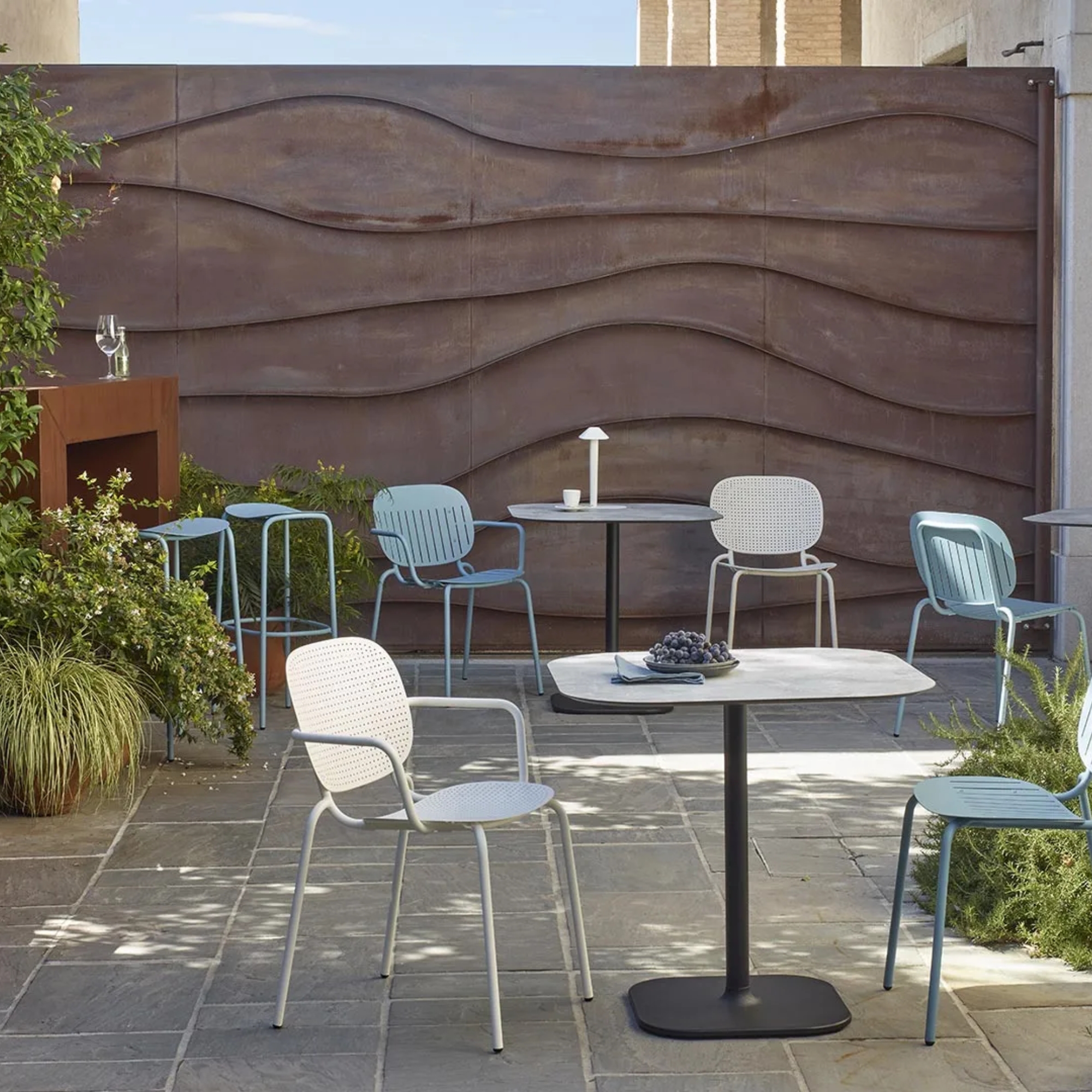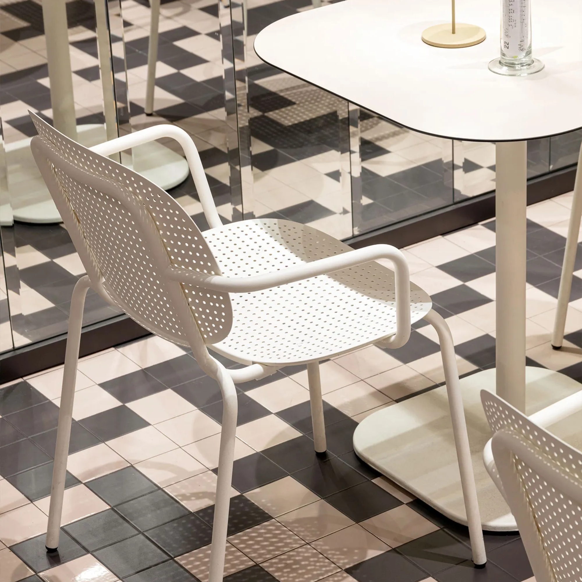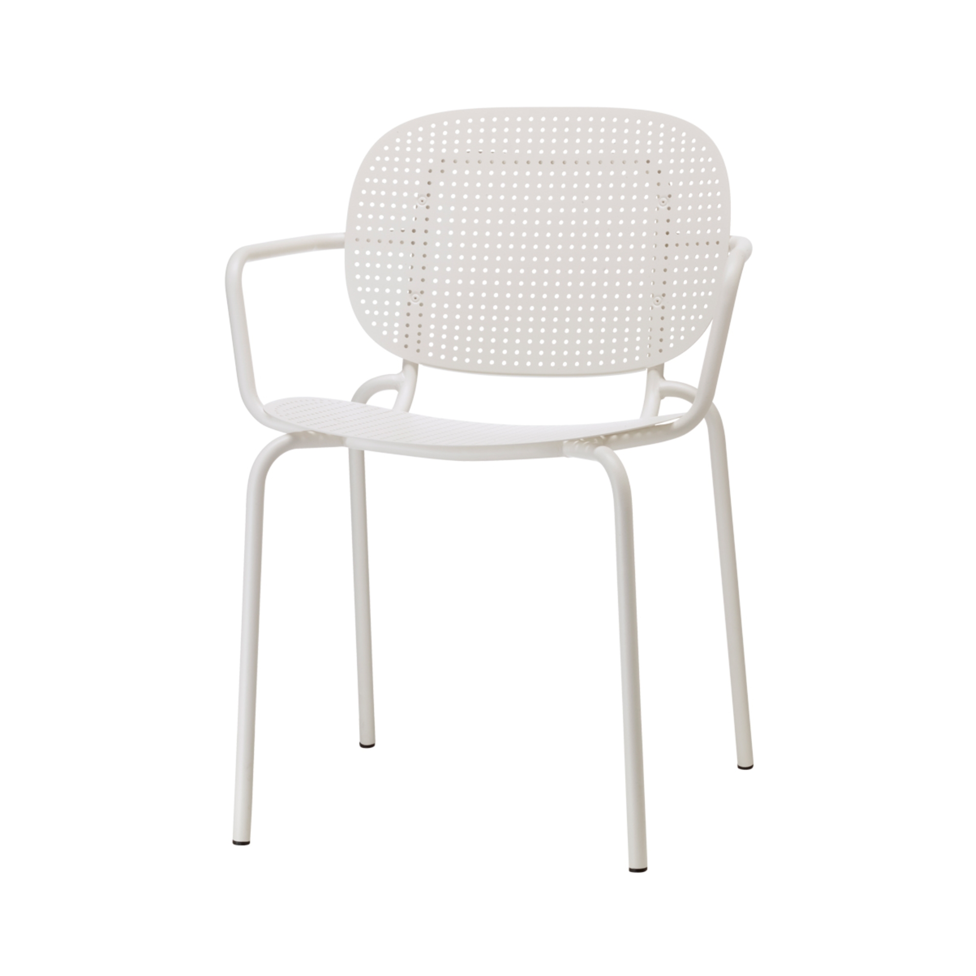 The Si-Si Dots Armchair is a versatile and contemporary seating piece defined by its distinctive dotted perforation pattern. Part of the modular Si-Si collection, it features a single steel shell that functions as both seat and backrest, mounted on a slim tubular frame. Designed for both indoor and outdoor use, it combines visual lightness with structural strength, making it ideal for hospitality, contract and modern residential environments. The design focuses on flexibility, with a stackable structure and a multi-material approach that adapts easily to different settings.