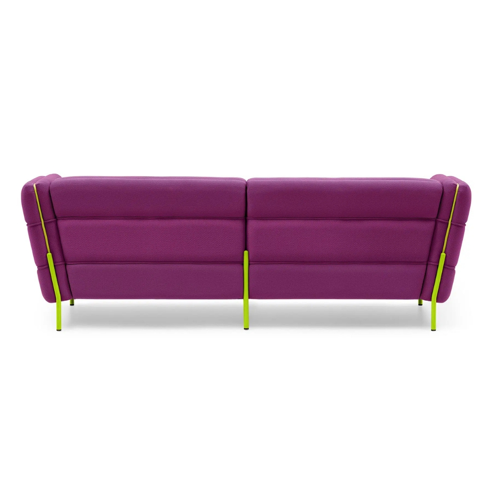 This armchair and modular sofa set features a bold, voluminous design with diagonally angled arms that enhance the sense of openness. The generous upholstery contrasts with a sleek metal base, elevating the piece to create a floating, weightless effect.