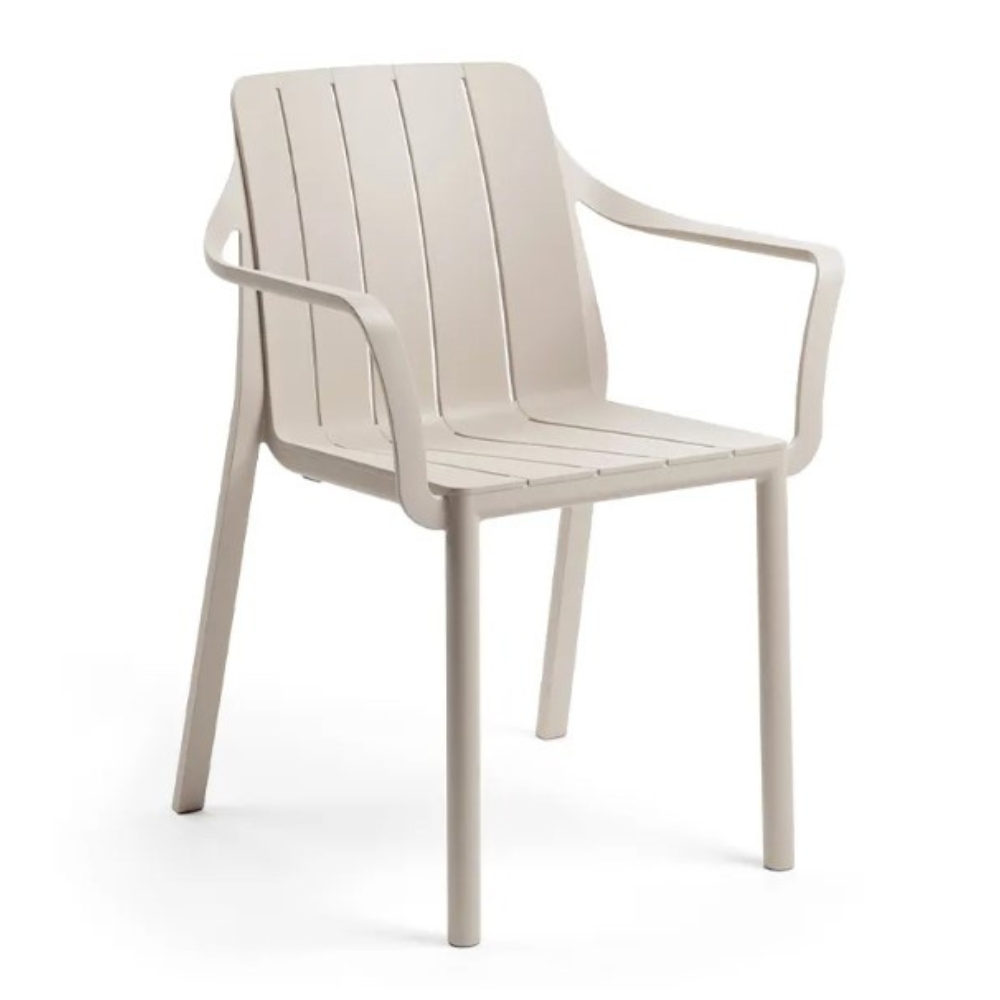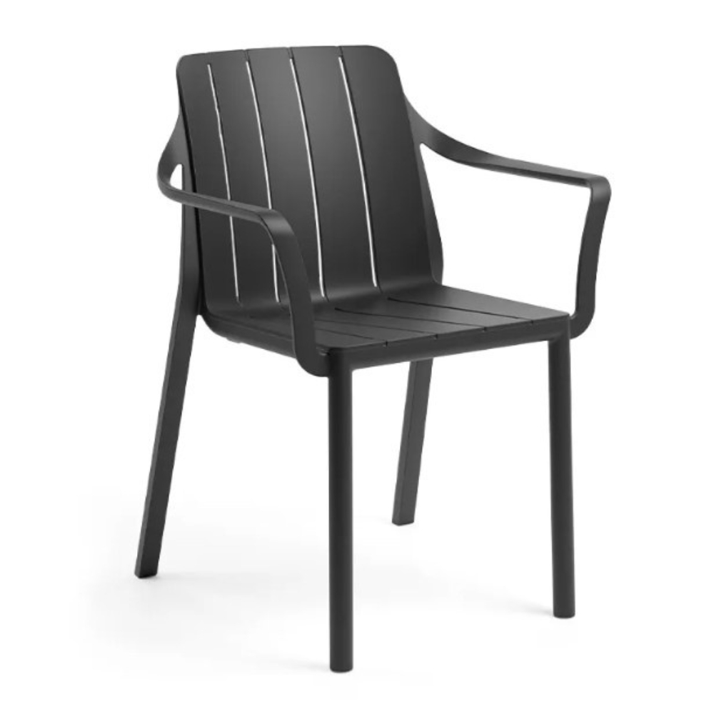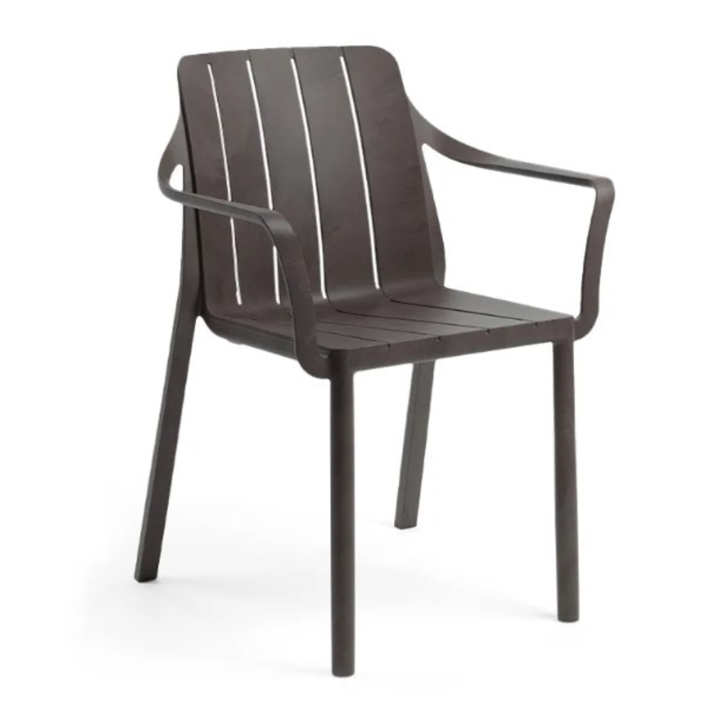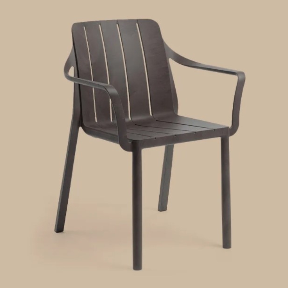 Model Number : 77354The eco-friendly Tiberina slatted chair with armrests showcases smooth, rounded lines and circular legs. This chair is crafted from uniformly coloured fiberglass polypropylene resins enhanced with UV additives. It features a matte finish, non-slip feet, and is made from recyclable resin.