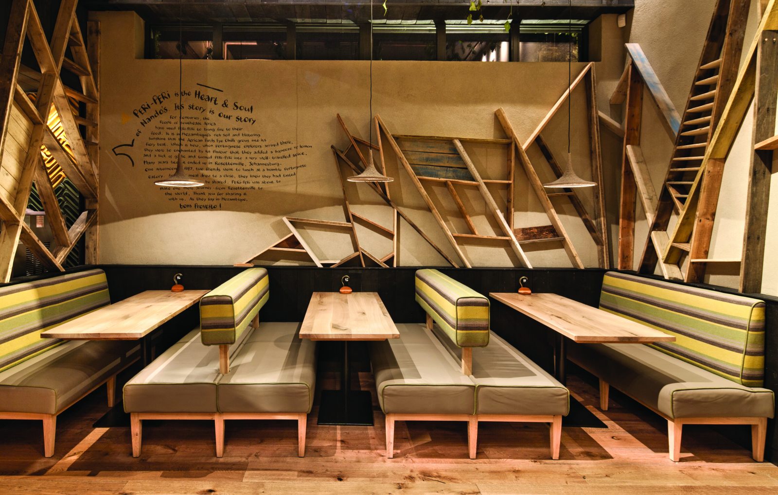 All Fabrics used were made from natural materials such as nettles which are inherently CRIB 5 and leathers were reconstituted or stock remaining from other jobs all wood stains and varnishes were all water based and low VOC. All this helped the Nandos achieve RICS SKA Gold, the highest possible sustainable fit-out rating, creating a blue print for all sustainable restaurants going forward.