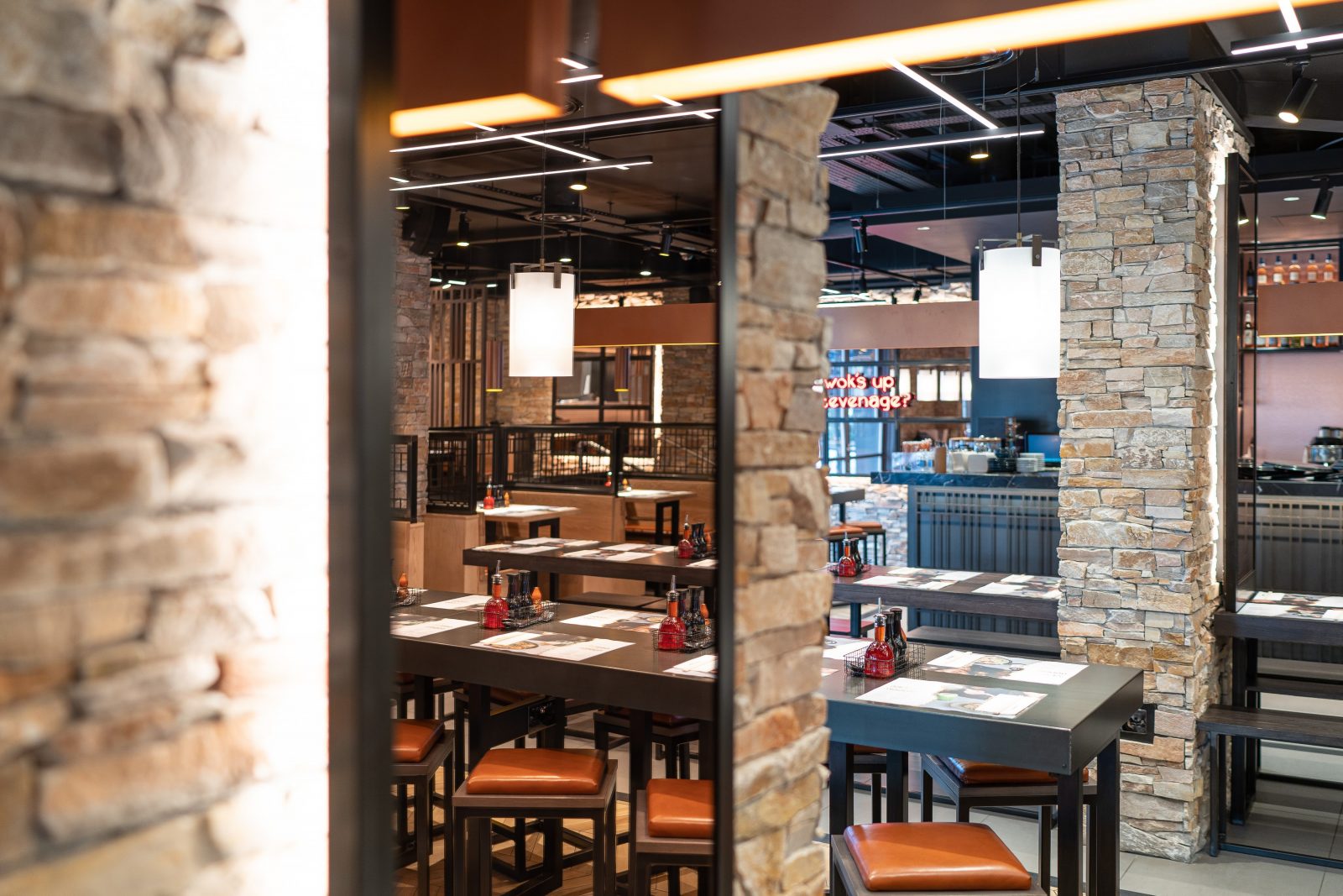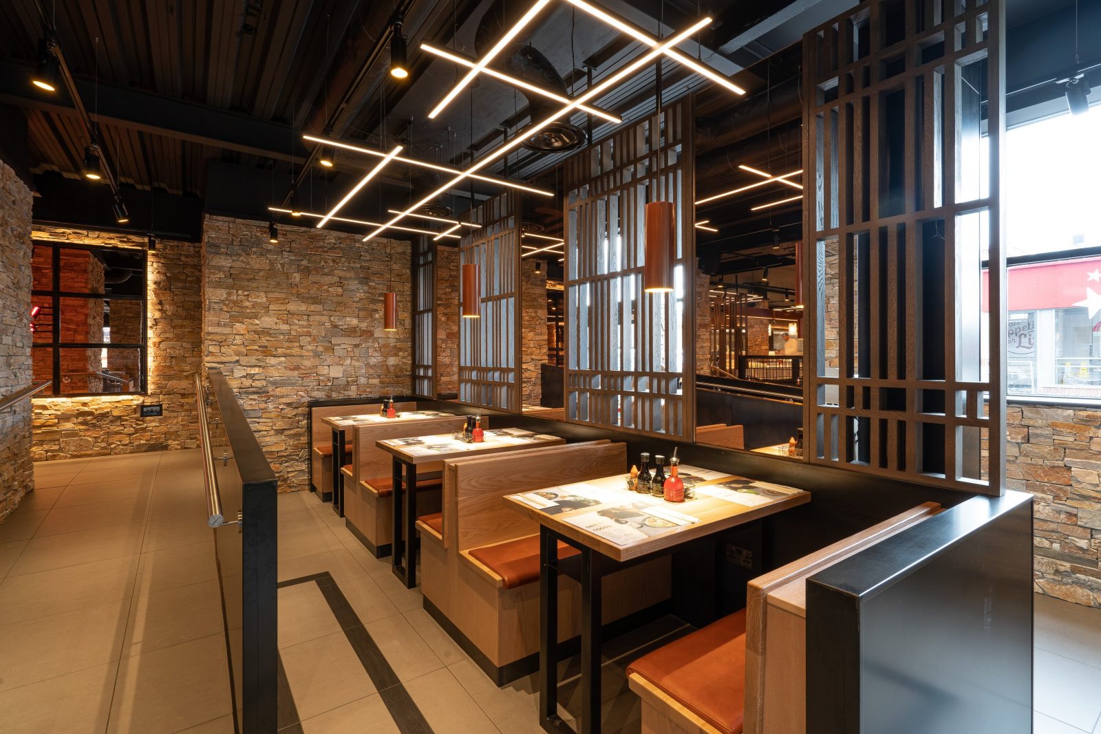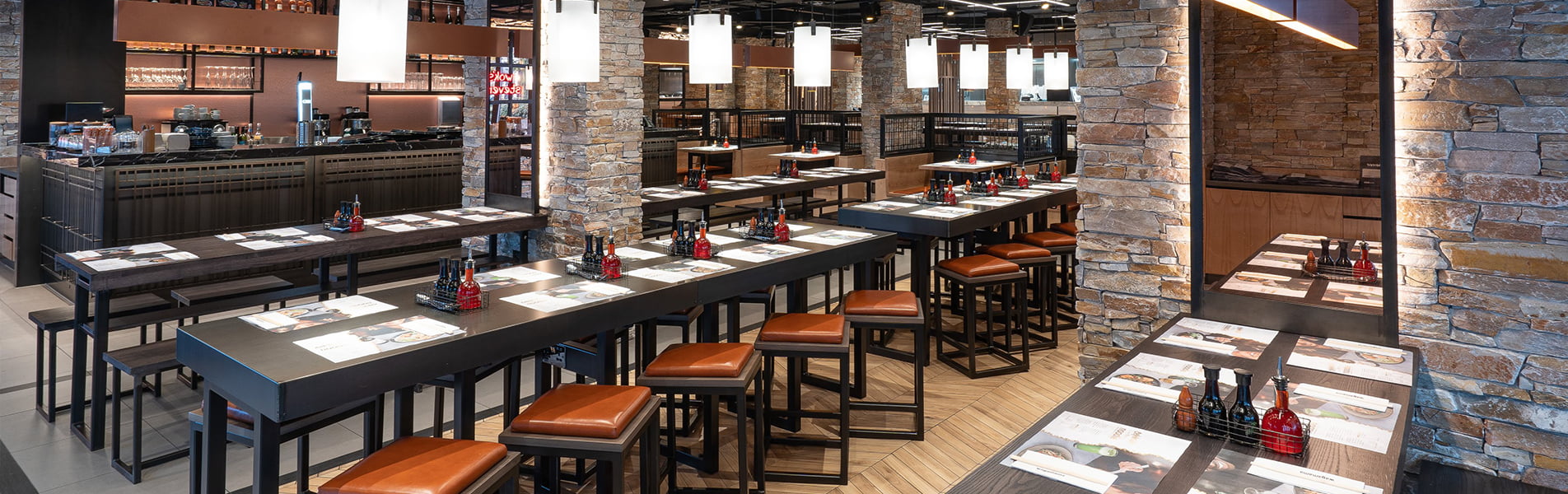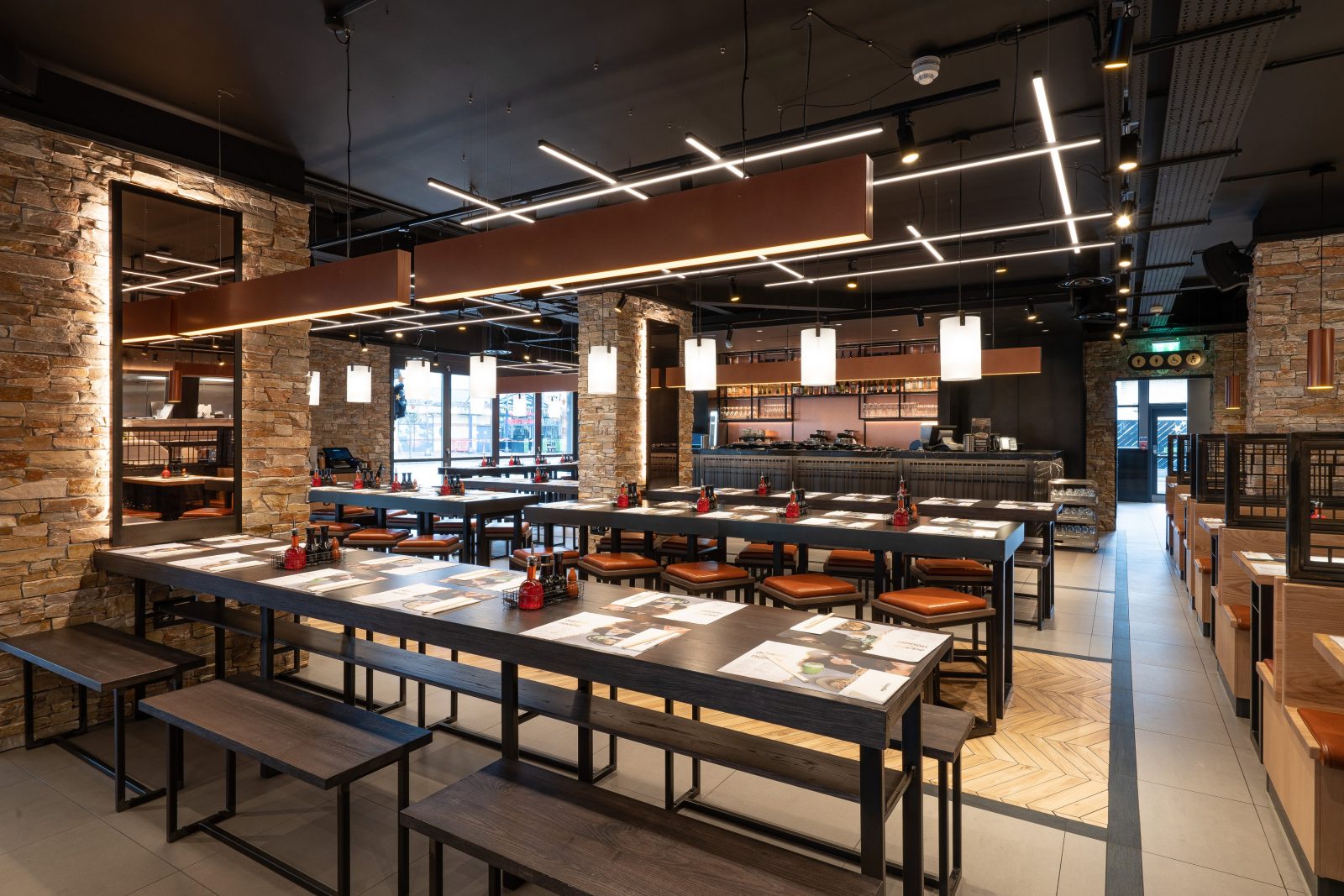 For Wagamama Stevenage, Hill Cross were approached to produce all furniture for the venue. Working with Quadrant Design, we supplied bespoke items including: Tables, matching stools and benches, fixed seating and host units. All of these had to be produced in black metal and dark timber with contrasting pieces like the fixed seating in lighter stains, finished with a tan leather upholstered seat.