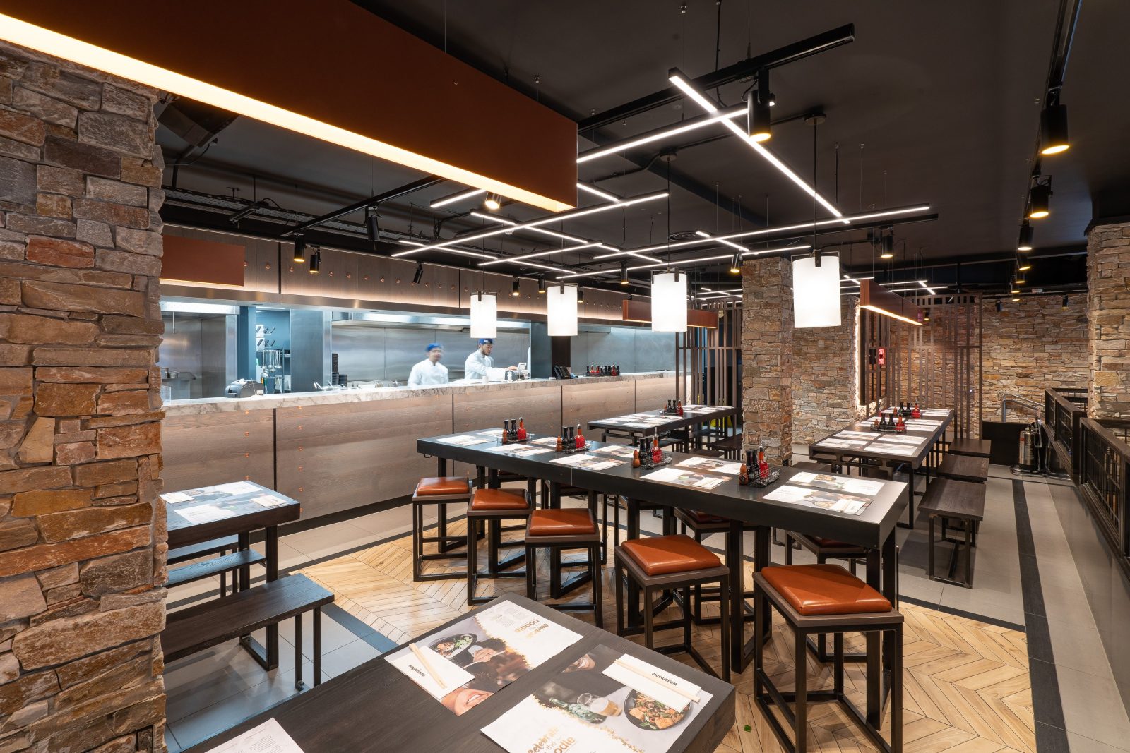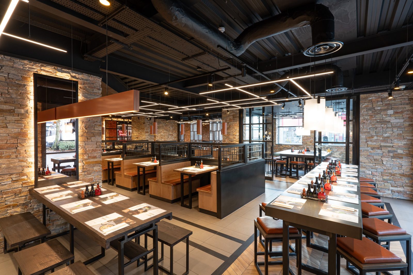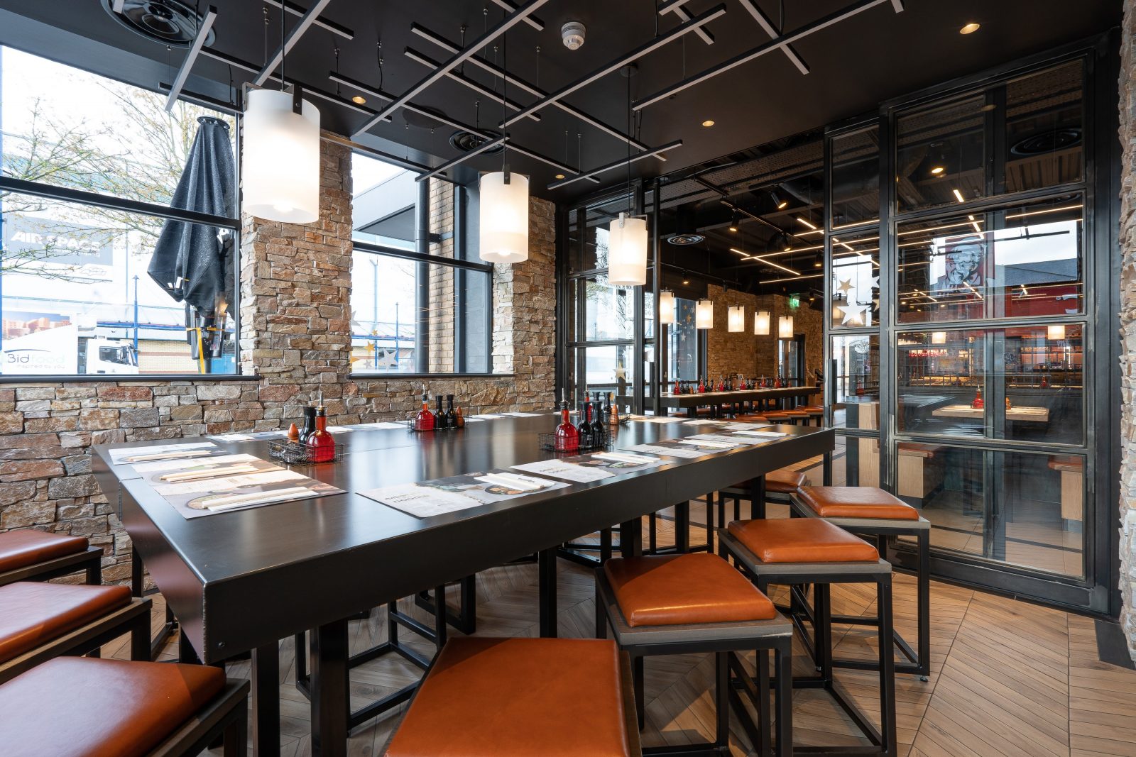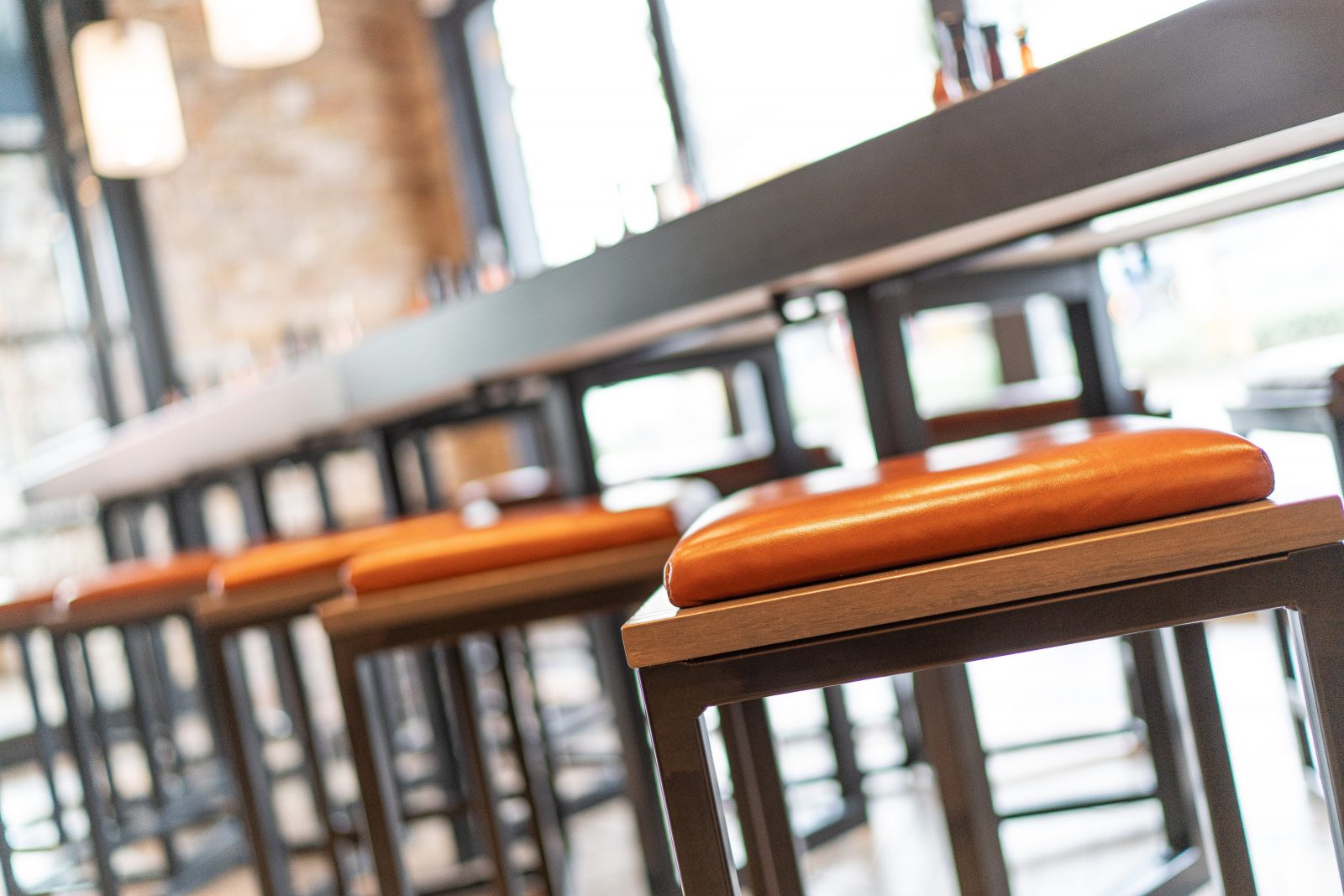 For Wagamama Stevenage, Hill Cross were approached to produce all furniture for the venue. Working with Quadrant Design, we supplied bespoke items including: Tables, matching stools and benches, fixed seating and host units. All of these had to be produced in black metal and dark timber with contrasting pieces like the fixed seating in lighter stains, finished with a tan leather upholstered seat.